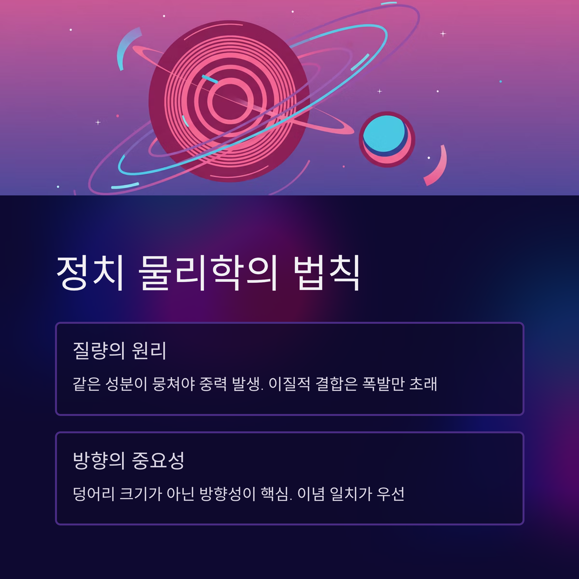 정치 질량의 법칙: 정치는 덩어리(Size)가 아닌 방향(Vector)의 문제입니다. 이념과 지향점이 다른 세력과의 무분별한 연대는 중력을 만드는 것이 아니라 내부 폭발을 야기할 뿐입니다.
