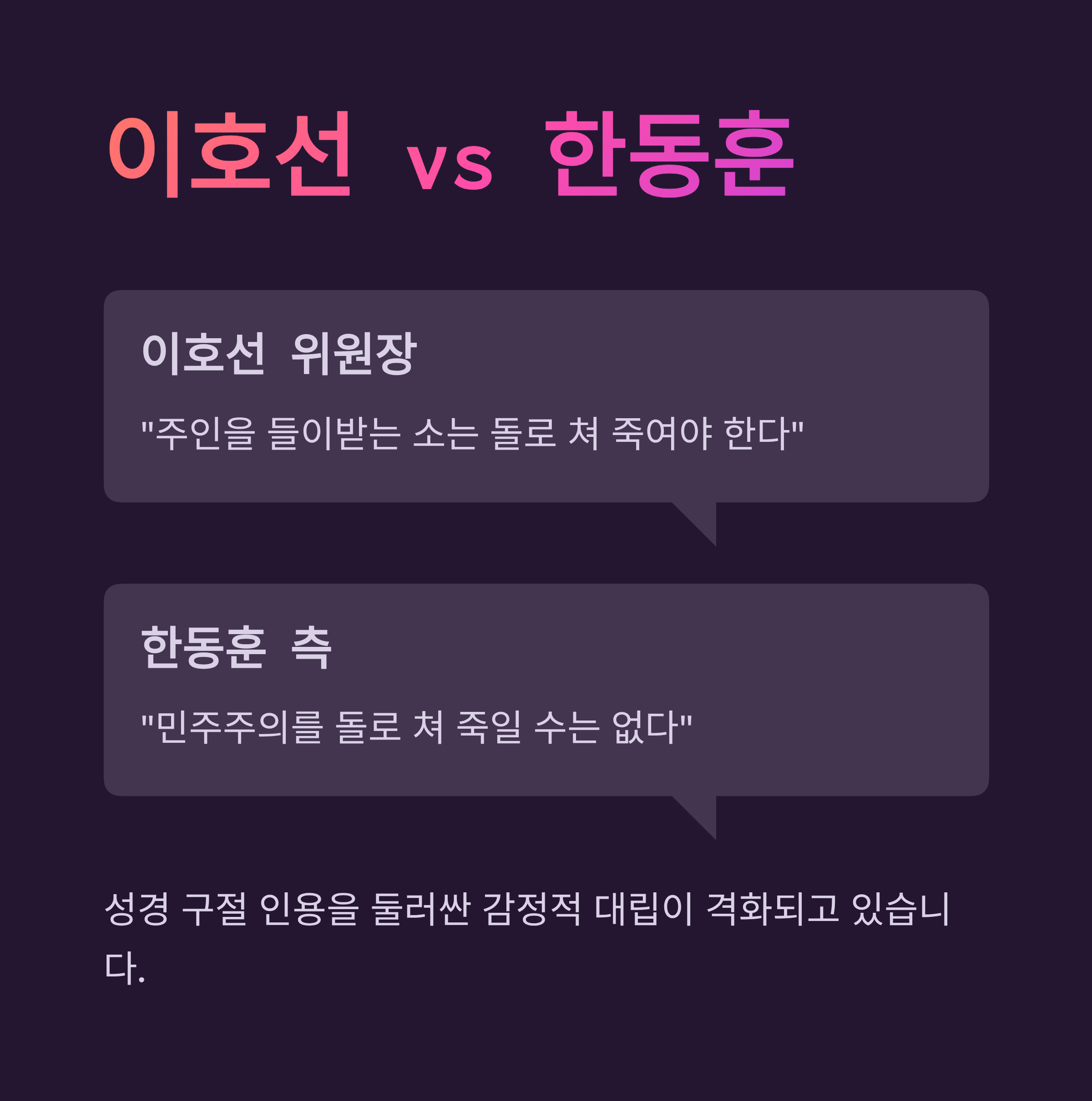 | A. 이호선 위원장은 블로그에 성경 구절을 인용해 "주인을 들이받는 소는 돌로 쳐 죽여야 한다"는 취지의 글을 올리며 해당 행위자를 비판했습니다. 이에 한동훈 측은 "민주주의를 돌로 쳐 죽일 수는 없다"고 반박하며 징계의 부당성을 주장했습니다. 이는 단순한 의견 차이를 넘어 당내 주류와 비주류 간의 감정적, 정치적 대립이 격화되고 있음을 보여줍니다. |