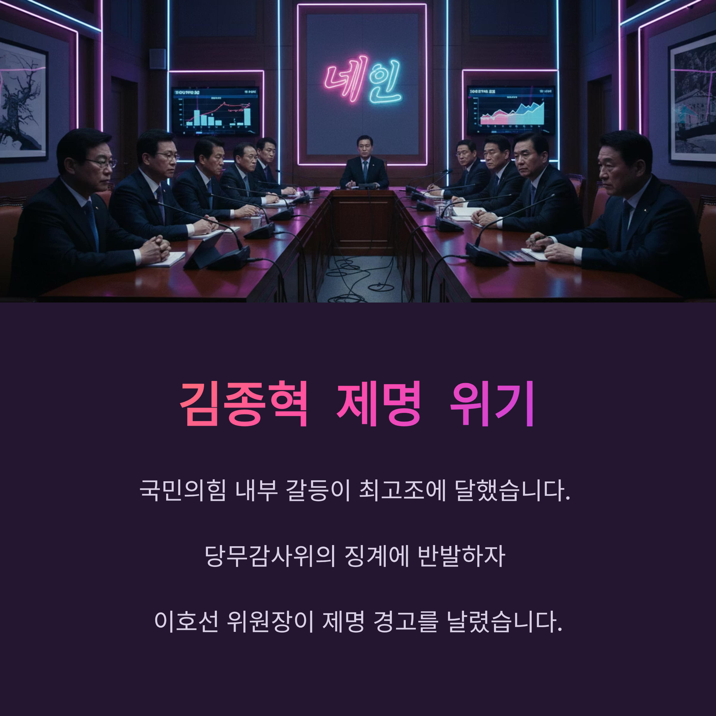 지방선거 영향: 지도부는 내년 6월 지방선거 승리를 위해 김종혁·한동훈 제명 경고를 통해 당내 불협화음을 조기에 차단하고 인적 쇄신을 단행하겠다는 의지를 분명히 하고 있습니다.