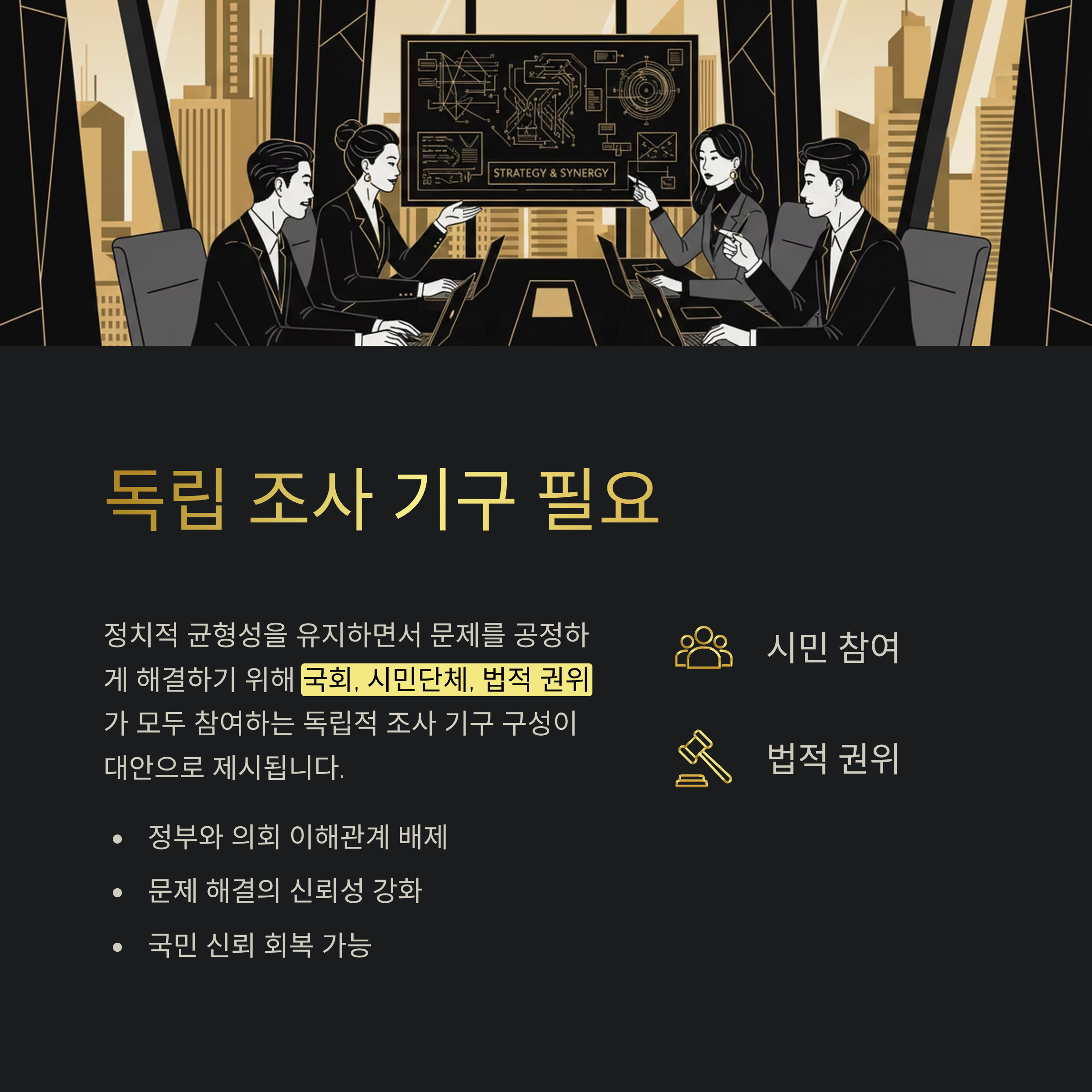 정치적 균형성을 유지하면서도 선거 제도의 문제를 공정하게 해결하기 위해, 국회와 시민단체, 법적 권위가 모두 참여하는 독립적 조사 기구를 구성하는 방안이 대안으로 제시되고 있습니다. 이러한 방식은 정부와 의회의 이해관계를 배제하고 문제 해결의 신뢰성을 강화할 수 있을 것입니다.