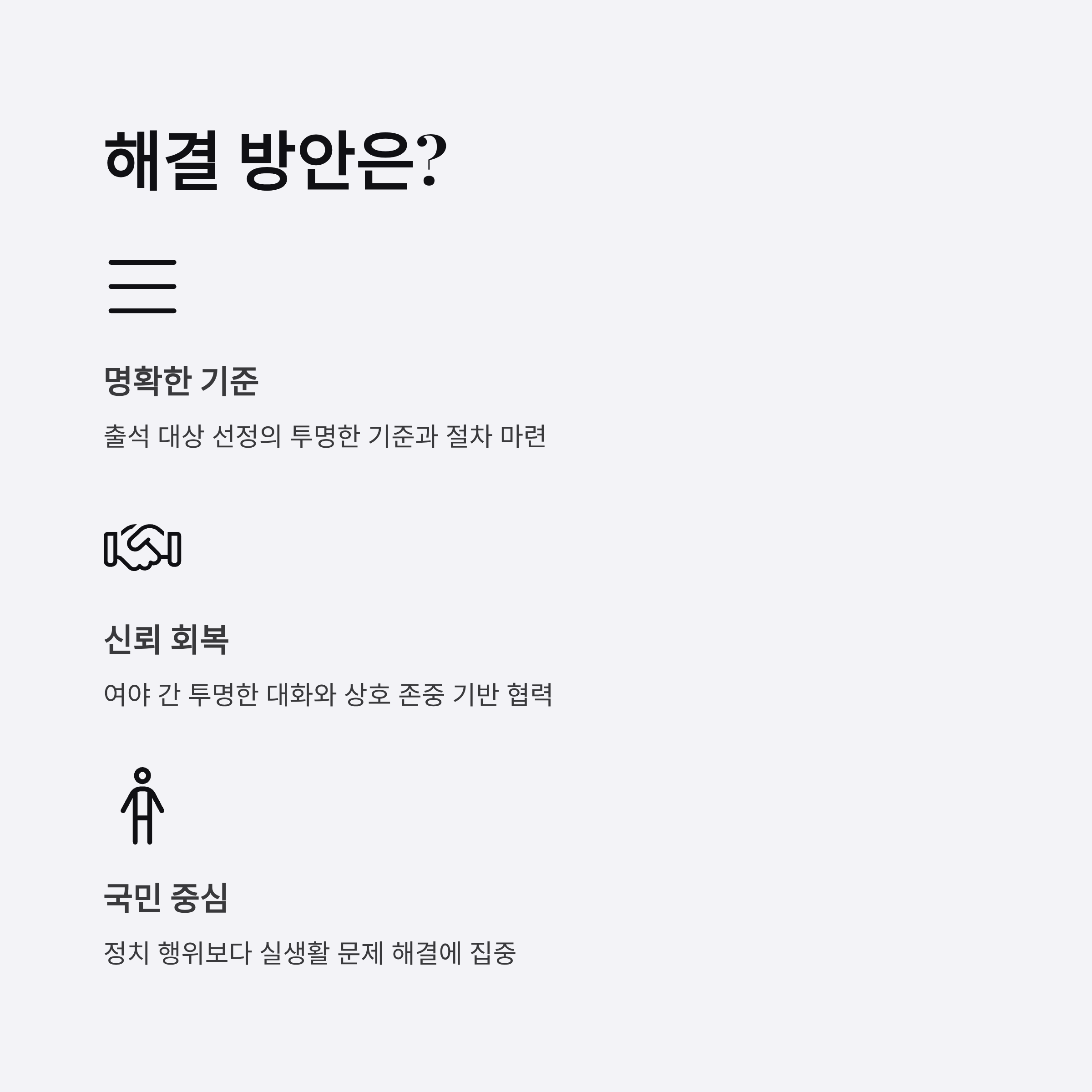 | A. 출석 기준 및 절차를 명확히 하고, 여야 간 상호 신뢰를 바탕으로 한 합리적인 대화 구조를 만들어야 합니다. 또한, 국회의 투명성과 효율성을 강화하기 위한 제도적 개혁도 병행되어야 합니다. |