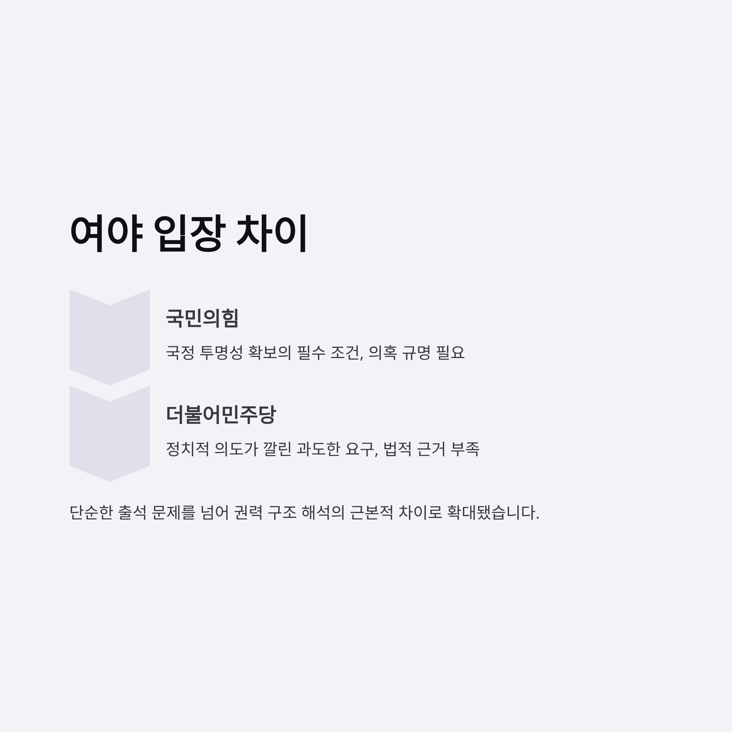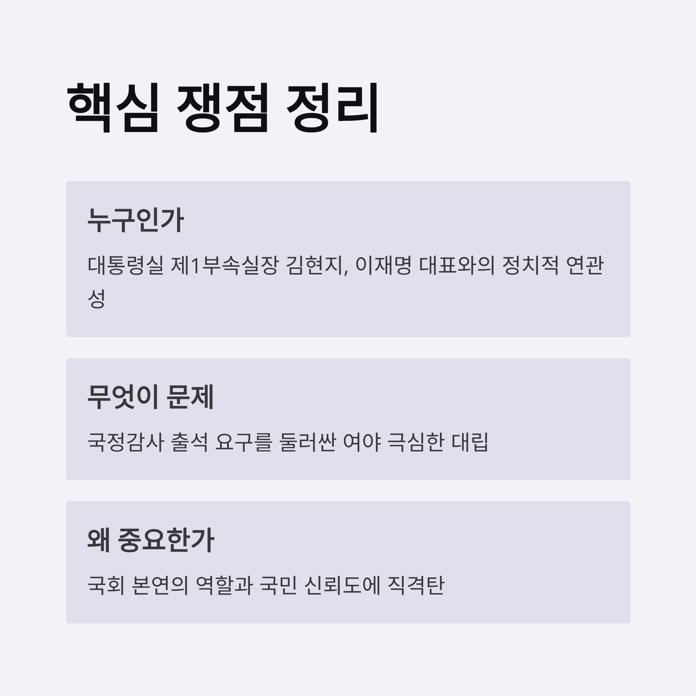 3. 김현지 출석 요구는 단순한 의혹 제기를 넘어 국회 권력 구조와 관련된 해석의 차이로 이어졌습니다.