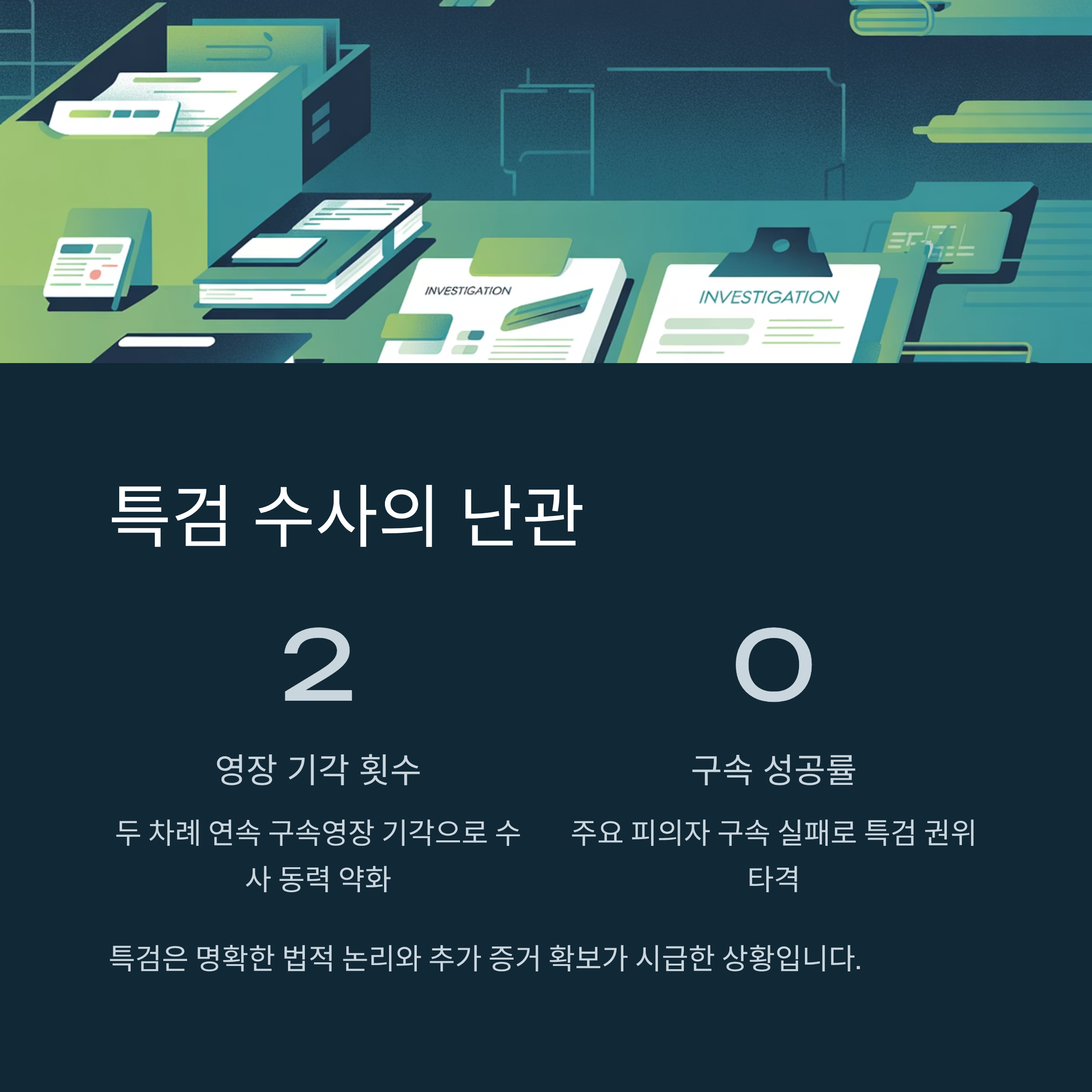 | A. 특검은 기각 결정에도 불구하고 추가적인 증거 확보와 명확한 법적 논리 개발을 통해 수사를 이어가고 있습니다. 하지만 기각된 두 차례 영장은 정치적 동력을 약화시킬 가능성을 보이고 있습니다. |