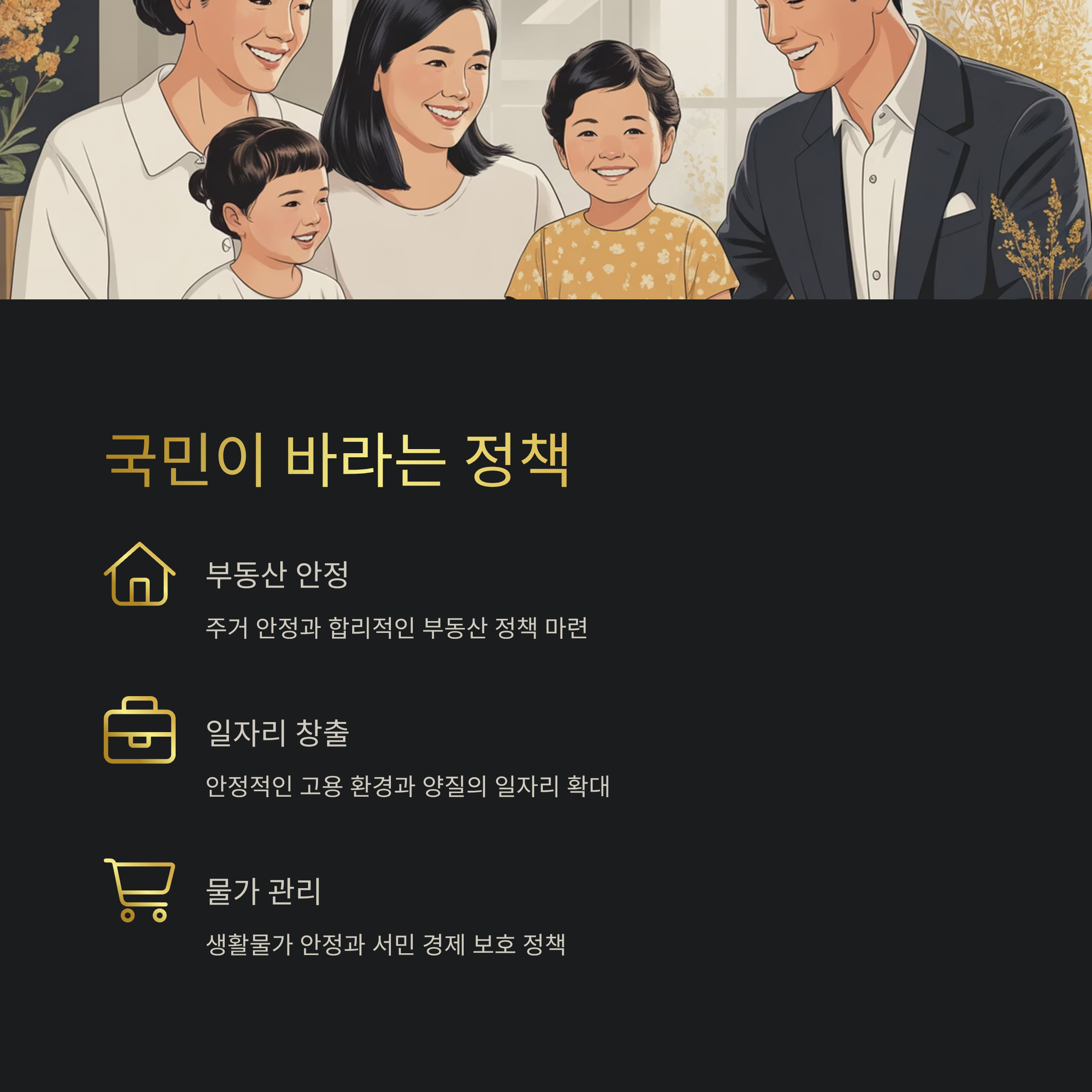 | A. 국민들은 부동산, 일자리 안정, 물가 관리와 같은 생활 밀착형 정책 실행을 가장 시급한 과제로 꼽고 있습니다. 특히, 경제적 안정과 미래 세대를 위한 지속 가능한 사회 구조를 요구하고 있습니다. |