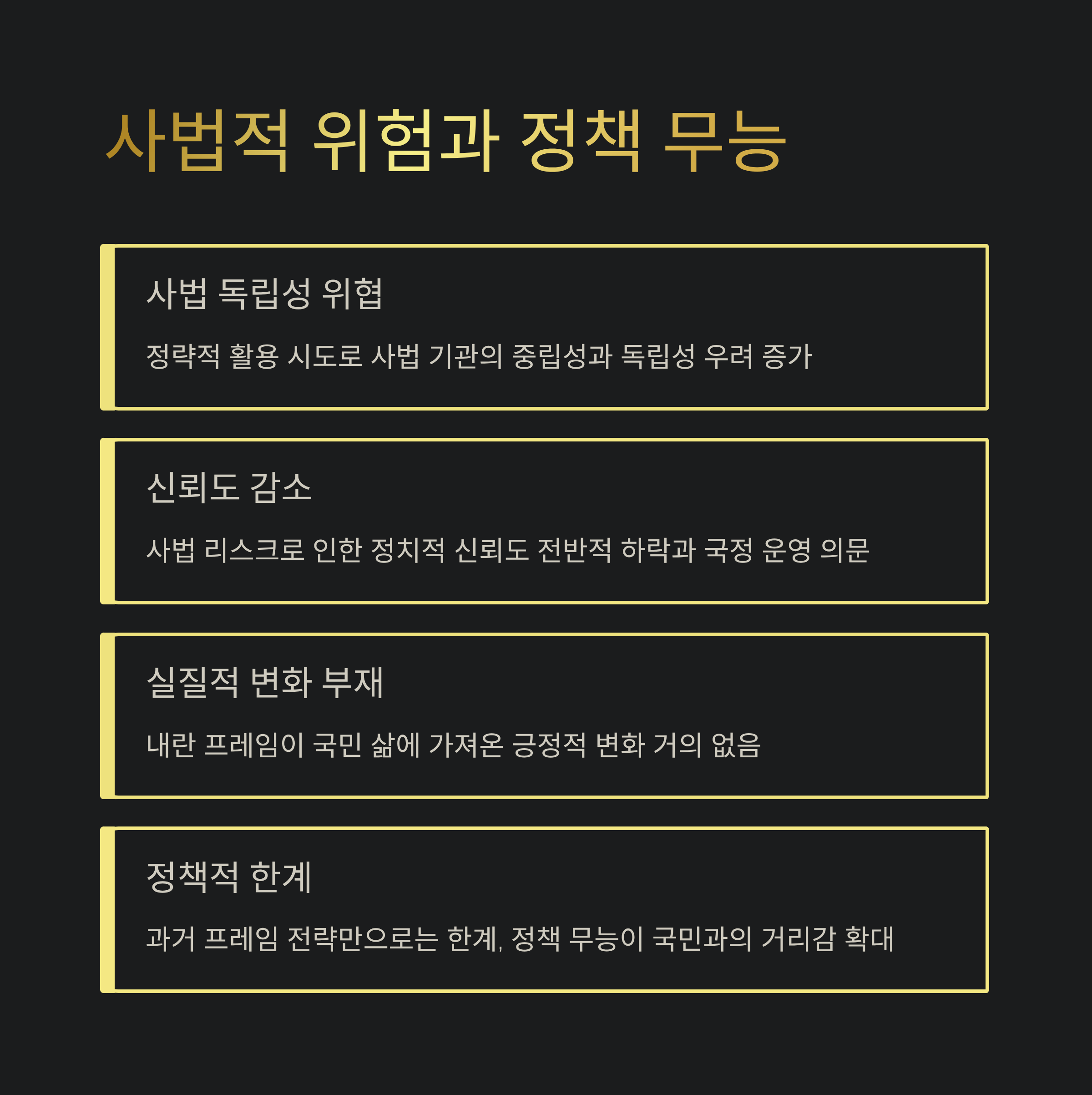 내란 프레임과 더불어 대두되고 있는 정치적 논점은 사법 리스크와 연결됩니다. 사법 체계가 이번 논란의 한가운데 있는 만큼 이를 정략적으로 활용하려는 시도는 사법 기관의 독립성과 중립성을 위태롭게 할 우려가 많다는 점이 전문가 사이에서도 제기되고 있습니다. 국민들 또한 사법 리스크로 인해 정치적 신뢰도가 전반적으로 감소하며 국정 운영의 근간까지 의문을 품고 있습니다. 또한, 내란 프레임이 국민에게 실질적으로 변화를 가져다준 사례가 거의 없다는 지적도 강하게 나옵니다. 일부 분석가들은 현 정권이 과거 프레임 전략에 의한 성과 만으로는 한계를 맞고 있으며, 정책적 무능이 국민의 실질적인 삶과 거리감을 더욱 키우는 주요 원인이라고 평합니다.