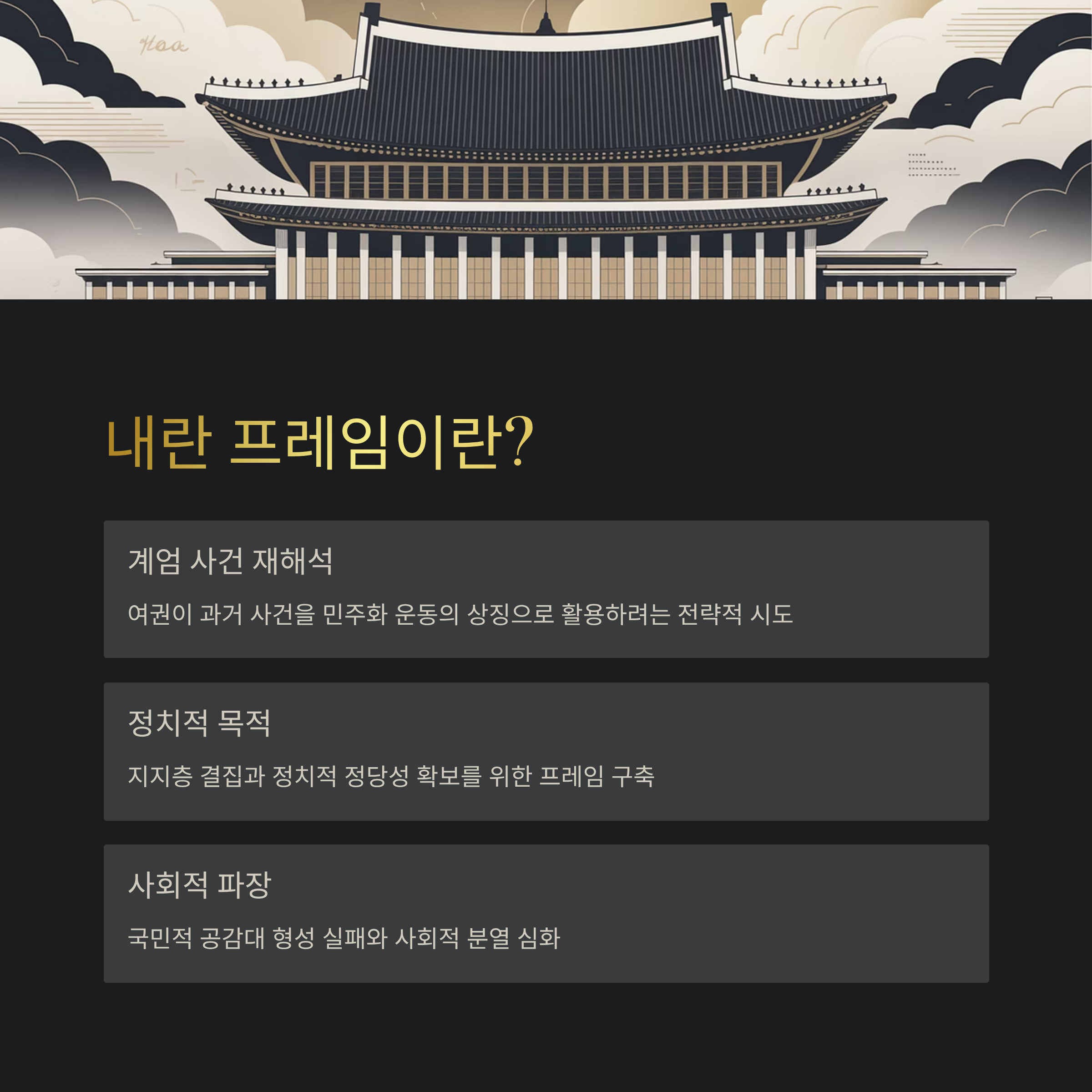 1. 내란 프레임은 여권이 계엄 사건을 민주화 운동의 상징으로 활용하려는 전략에서 비롯되었습니다.
