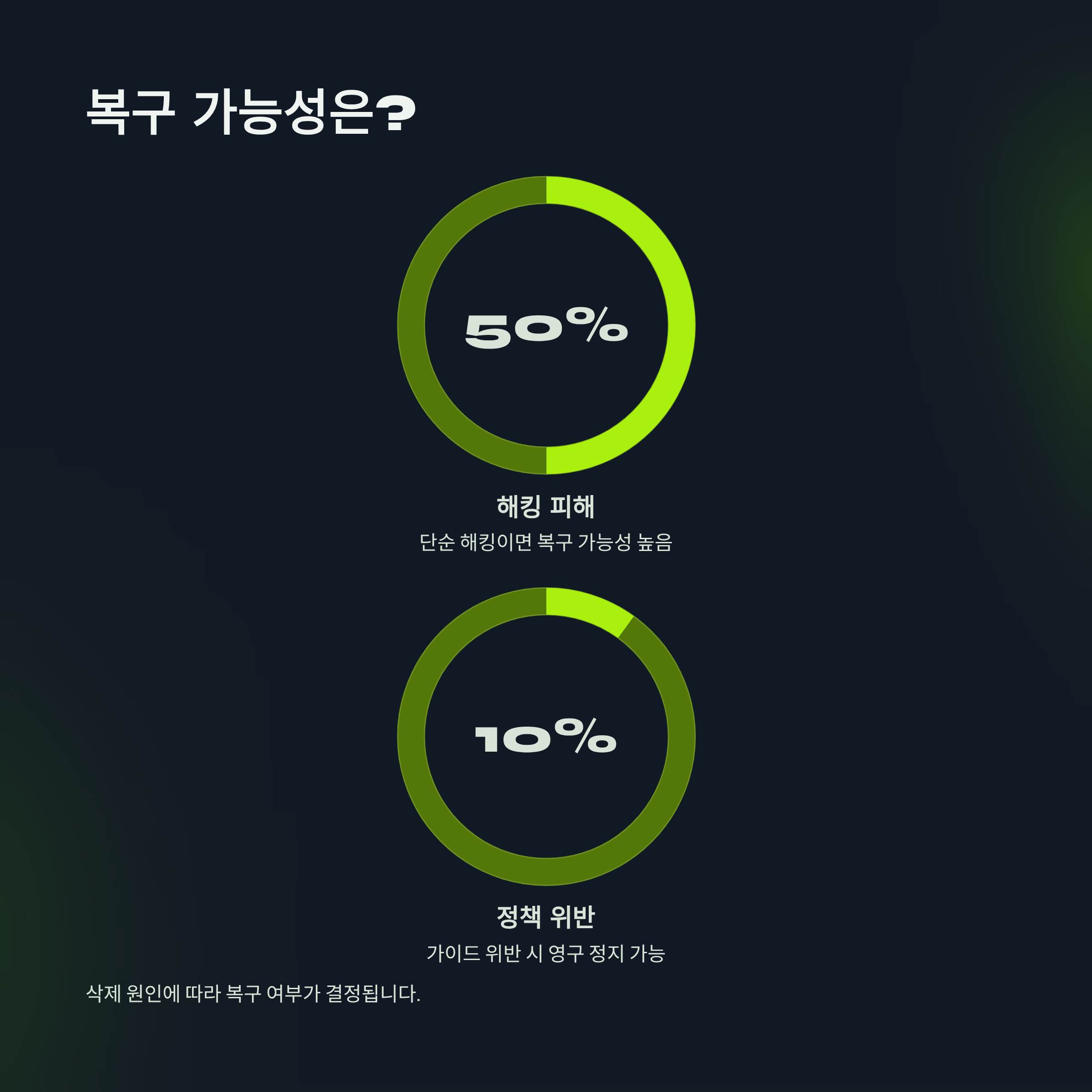 | A. 삭제 원인에 따라 다릅니다. 단순 해킹 피해로 판명되면 복구될 가능성이 높습니다. 하지만 개인정보 공개 등 중대한 커뮤니티 가이드 위반으로 인한 영구 정지라면 복구는 매우 어려울 수 있습니다. |