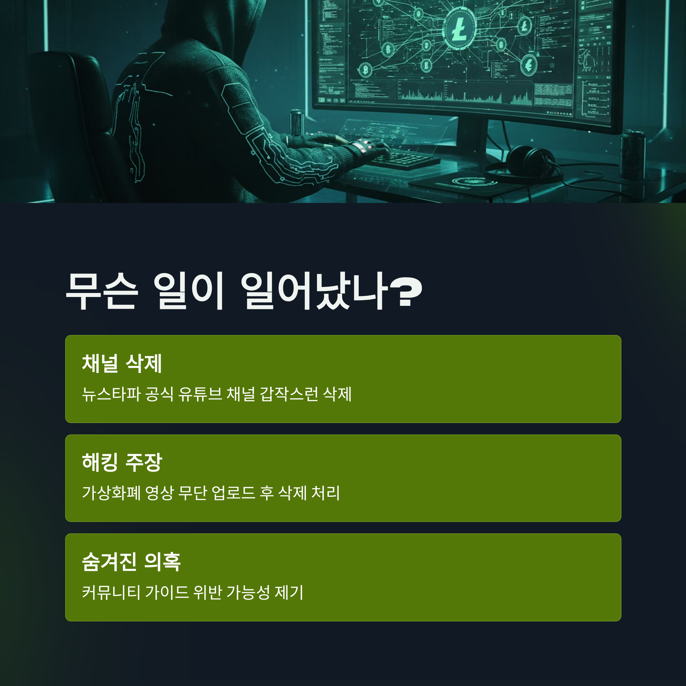 뉴스타파는 채널 삭제의 원인으로 '해킹'을 지목했습니다. 실제로 채널이 해킹당했을 때 나타나는 전형적인 현상인 가상화폐 관련 영상이 무단으로 업로드된 정황이 있어, 해킹이 이루어진 것 자체는 사실로 보입니다. 일반적으로 이런 해킹 피해 채널은 유튜브 측의 조사를 거쳐 복구되는 경우가 많습니다. 뉴스타파 역시 이를 근거로 즉각적인 복구를 촉구하며 자신들이 피해자라는 입장을 고수하고 있습니다.