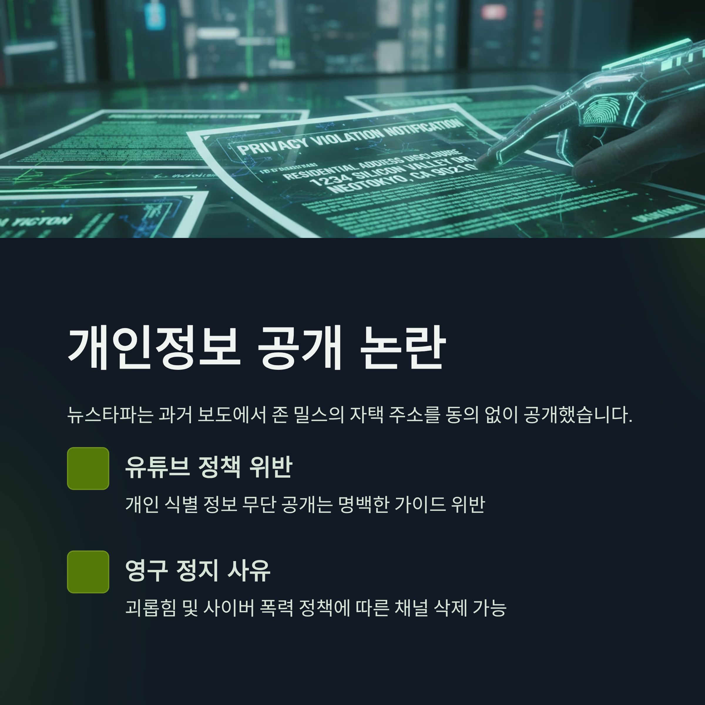 하지만 이번 삭제가 해킹이 아닌 영구 정지 조치일 가능성도 배제할 수 없습니다. 과거 뉴스타파가 '국제 선거 감시단'을 보도하며 존 밀스라는 특정 인물의 자택 주소를 그대로 공개한 사실이 문제의 소지가 됩니다. 유튜브 커뮤니티 가이드는 개인 식별이 가능한 비공개 정보를 동의 없이 공개하여 괴롭힘의 대상이 되도록 하는 행위를 명백히 금지하고 있습니다. 만약 해당 인물이 이를 문제 삼아 유튜브에 신고했다면, 이는 채널 영구 삭제의 중대한 사유가 될 수 있습니다. 해킹 사건과 별개로 누적된 가이드 위반이 이번 기회에 조치되었을 가능성입니다.