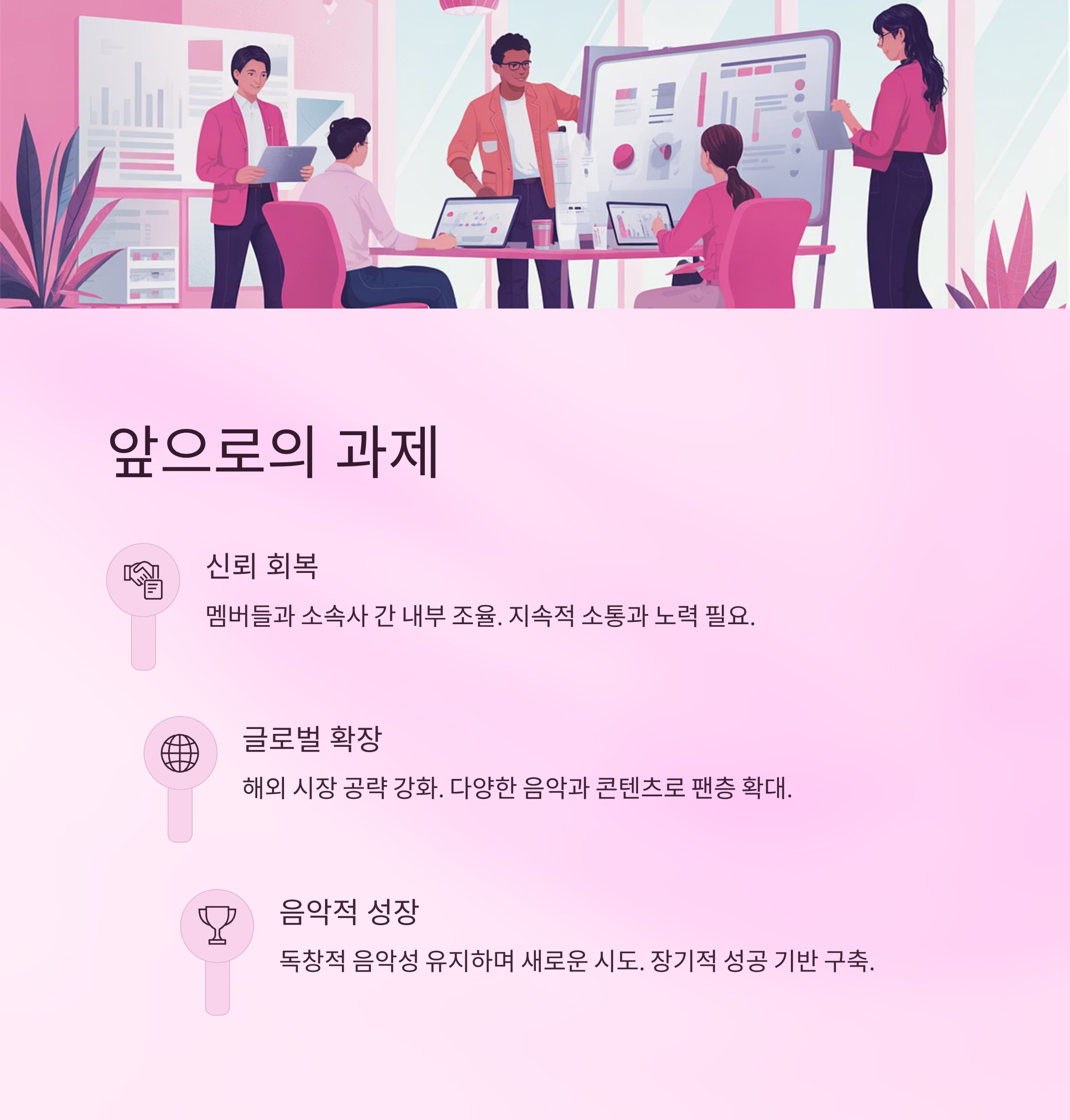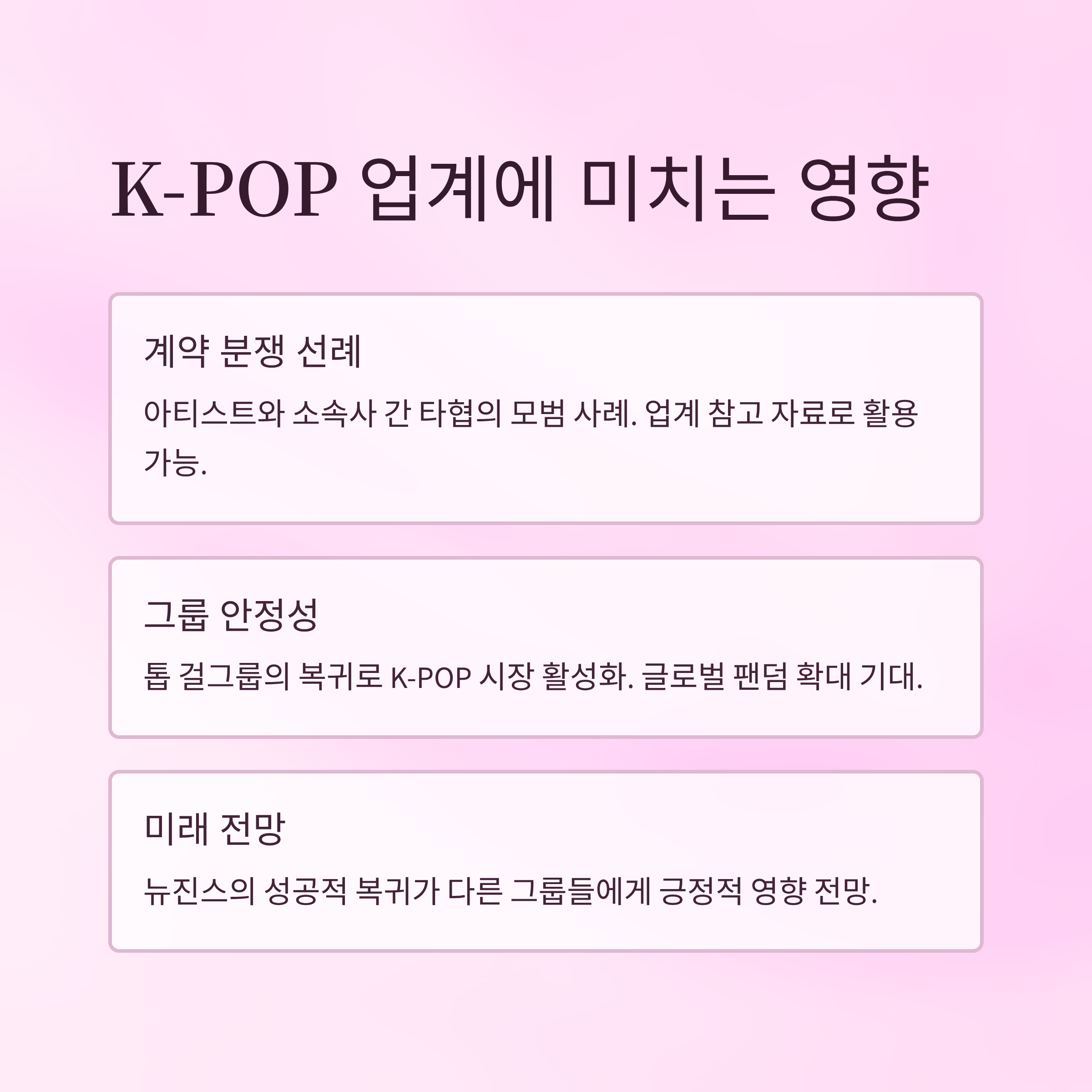 이번 뉴진스의 복귀 결정은 그룹 활동뿐 아니라 K-POP 업계 참여자들에게도 깊은 영향을 미칠 전망입니다. 법적 분쟁으로 흔들리던 관계를 회복하려는 멤버들의 선택과 어도어의 유연한 접근은 탁월한 타협의 사례로 남을 것입니다. 뉴진스는 앞으로 그룹과 개인 활동을 병행하며 글로벌 시장으로 확장될 가능성이 큽니다. 팬들은 이들의 재결합으로 더욱 다채로운 음악과 무대를 기대할 수 있습니다. 그러나 내부 조율과 신뢰 회복은 여전히 중요한 과제로 남아 있으며, 이는 향후 몇 년 동안 지속적인 주의와 노력이 필요할 것입니다.