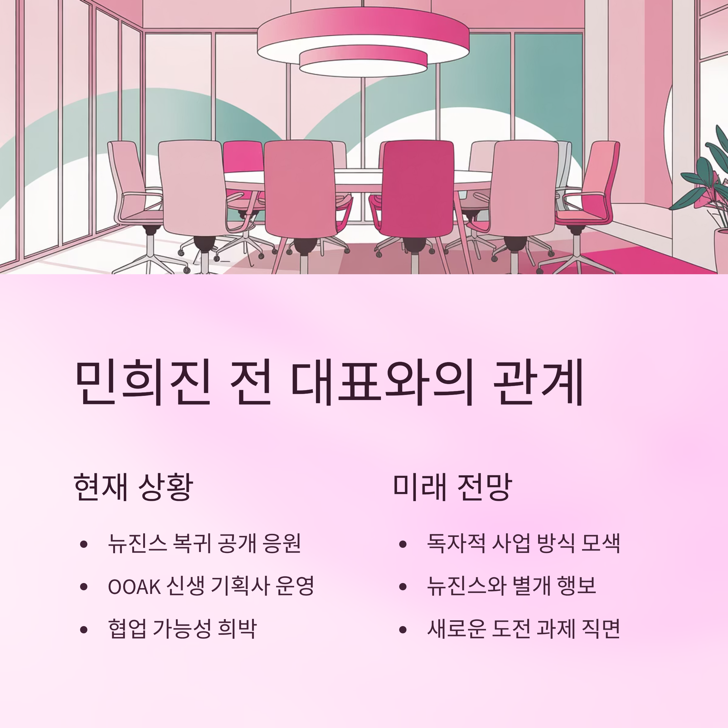 민희진 전 어도어 대표와 뉴진스 간의 관계는 복잡합니다. 민 전 대표는 뉴진스 복귀를 공개적으로 응원했지만, 이 관계가 다시 협력적 구도로 변화할 가능성은 낮아 보입니다. 특히 신생 기획사 OOAK는 뉴진스를 중심으로 한 사업 방향 전개가 더 어려워졌고, 이에 따라 뉴진스와 민 대표의 협업 가능성은 거의 사라졌습니다. 이는 민 전 대표가 독자적인 사업 방식을 모색해야 하는 또 다른 도전 과제가 될 것입니다.