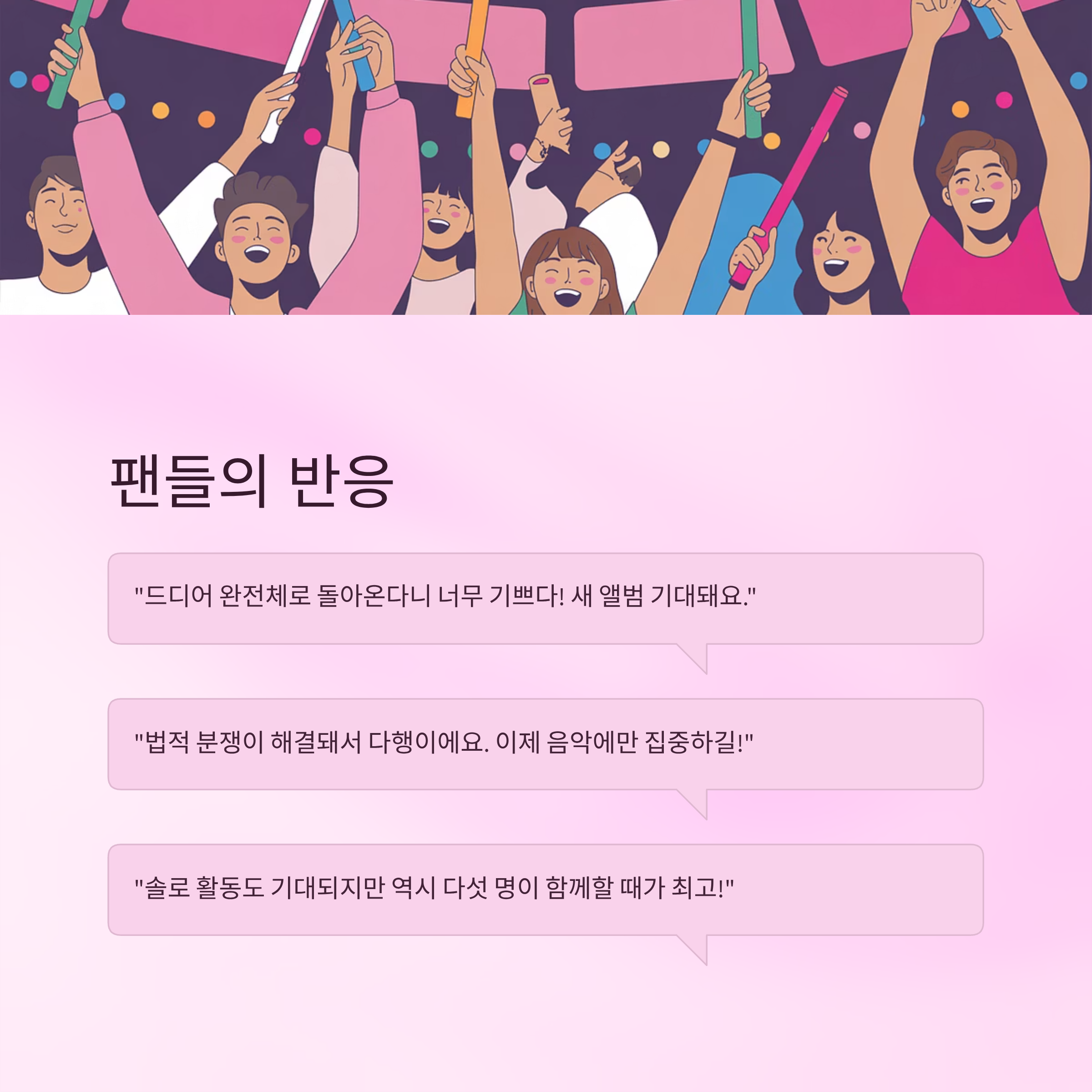 5. 팬들은 이번 복귀 소식에 큰 기대를 보이고 있으며, 뉴진스의 새로운 음악 및 프로젝트에 대한 관심이 고조되고 있습니다.