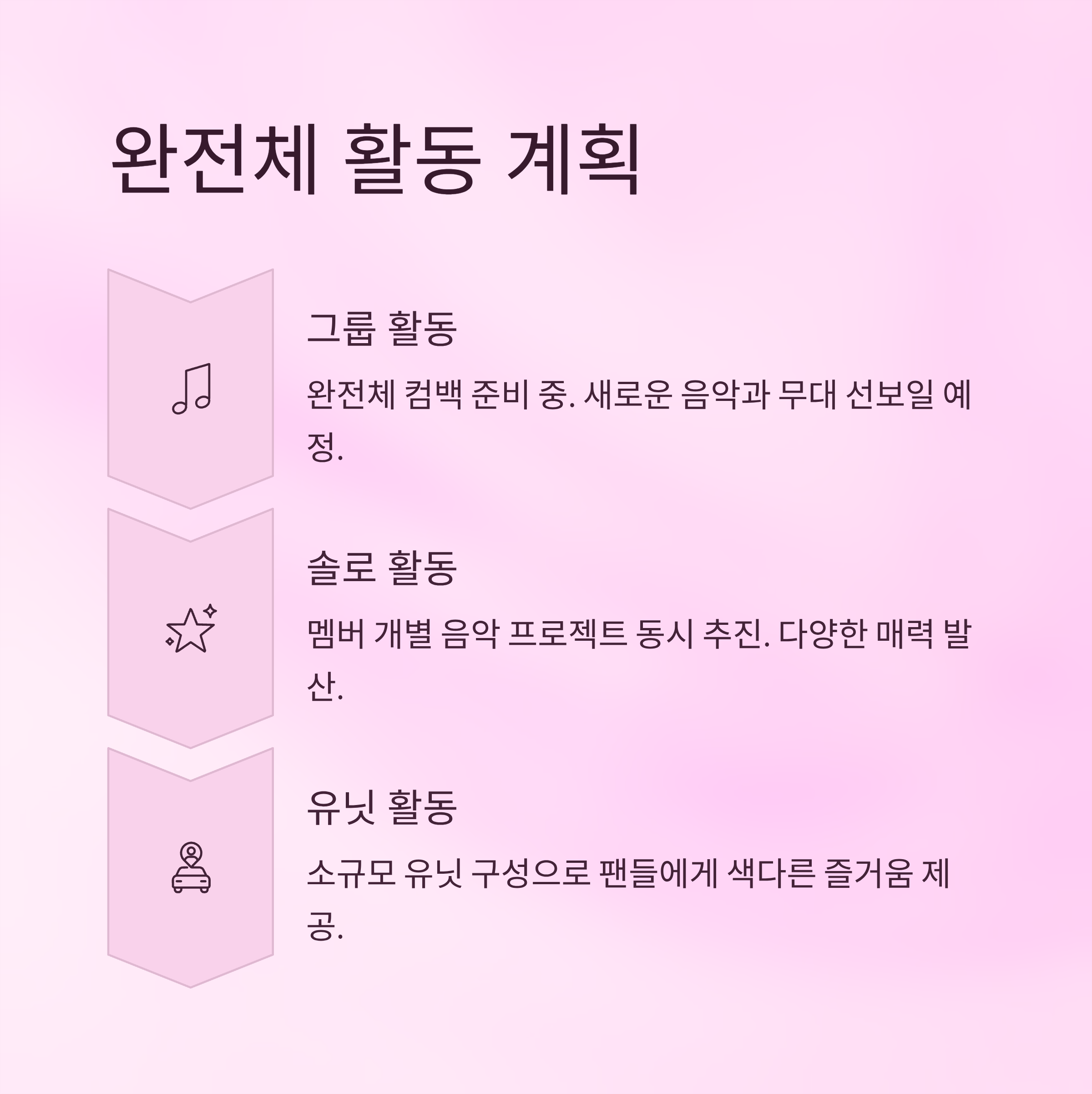 | A. 아직 구체적인 복귀 일정은 발표되지 않았습니다. 다만 점진적인 활동 재개가 예상되며, 완전체 컴백 직전에 단독 또는 유닛 활동이 가능할 것입니다. |