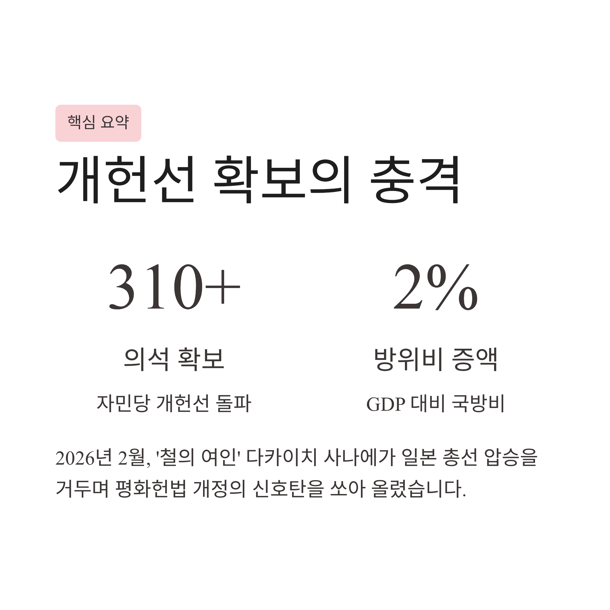 자민당 압승과 개헌 추진: 다카이치 체제는 단독 과반을 넘어 개헌선을 확보함으로써 '전쟁 가능한 국가'로의 전환을 위한 평화헌법 개정을 강력히 추진할 동력을 얻었습니다.
