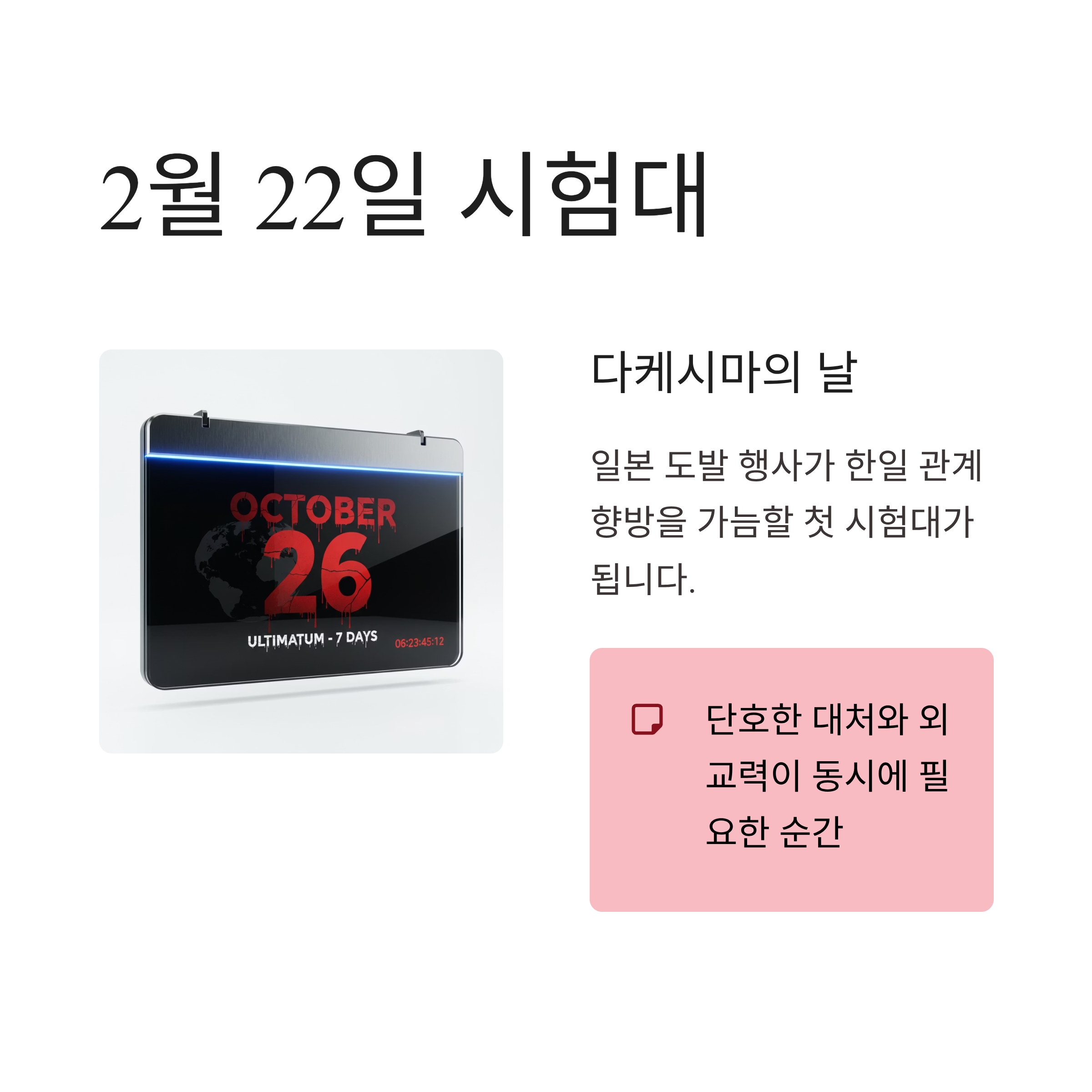 다카이치 정권의 출범과 일본의 재무장은 이제 피할 수 없는 현실이 되었습니다. 이재명 정부는 과거사와 안보, 경제가 복잡하게 얽힌 현 상황에서 감정적 대응보다는 냉철한 국익 중심의 전략을 수립해야 합니다. 당장 다가오는 2월 22일 일본의 '다케시마의 날' 행사는 양국 관계의 향방을 가늠할 첫 시험대가 될 것입니다. 일본의 도발에는 단호히 대처하되, 급변하는 국제 정세 속에서 한미일 공조의 끈을 놓지 않고 국익을 극대화할 수 있는 고도의 외교력이 절실히 요구되는 시점입니다.