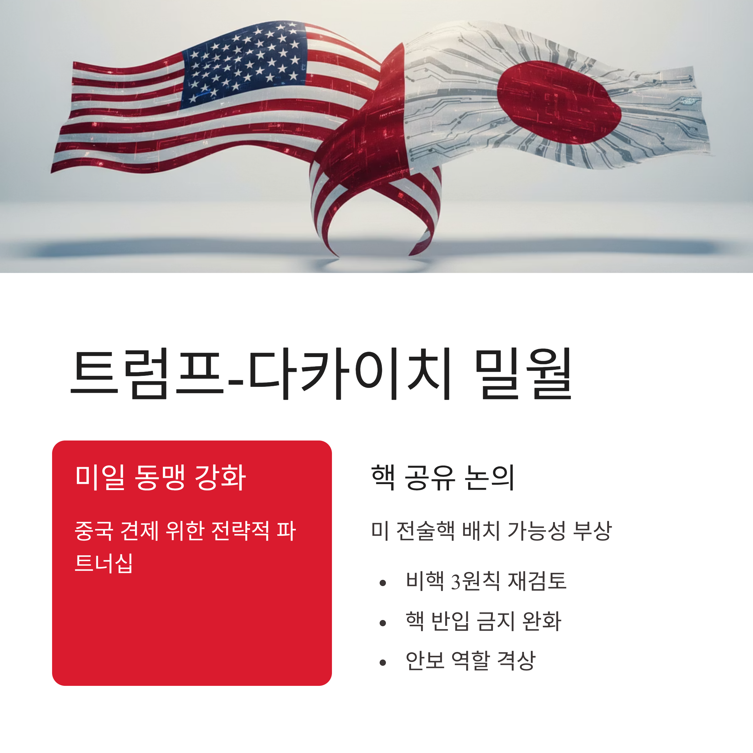 미일 동맹의 질적 변화: 트럼프의 고립주의 노선과 일본의 재무장 욕구가 맞물려, 일본이 미국의 아시아 안보 파트너로서 역할이 격상되고 핵 공유 논의까지 부상하고 있습니다.
