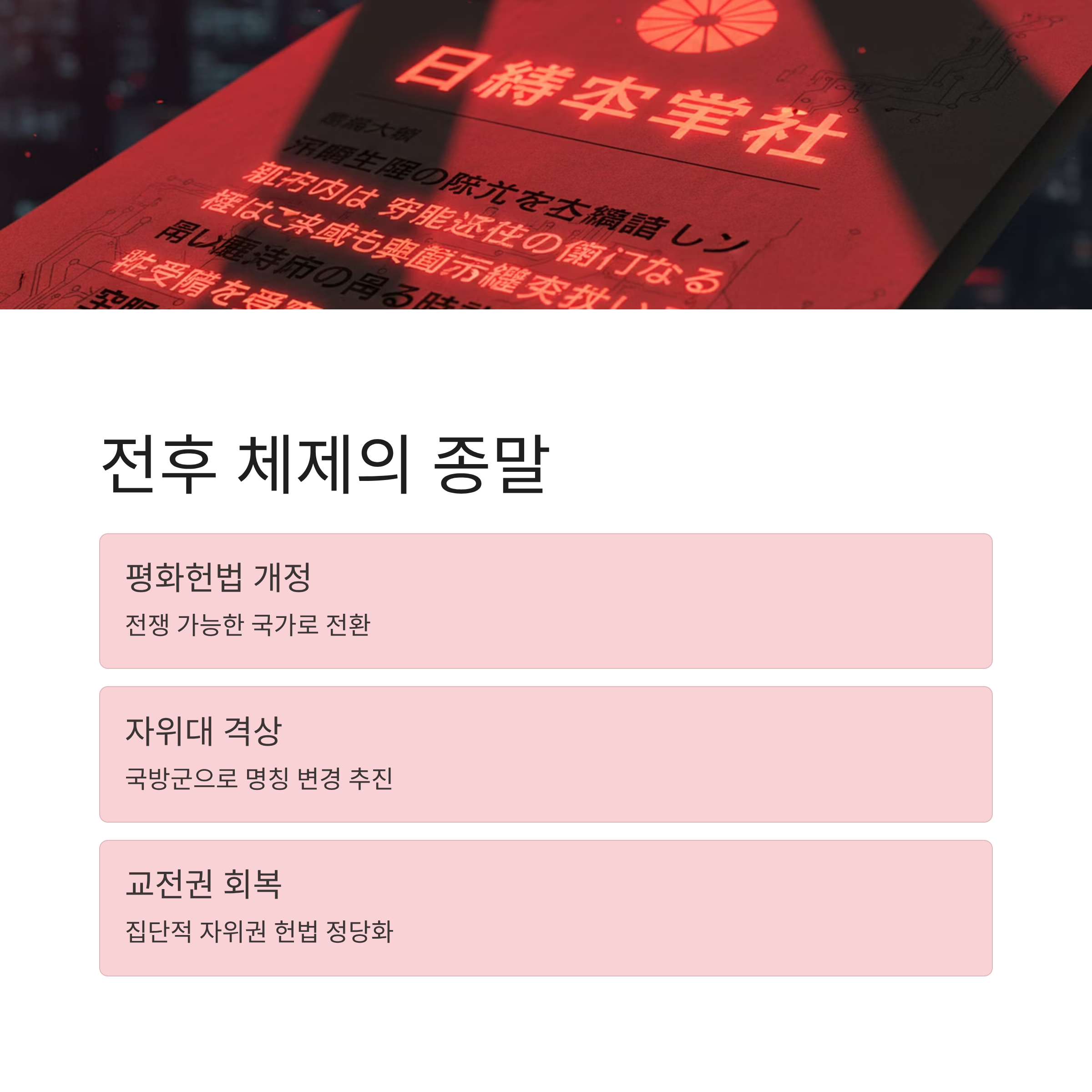 | A. 다카이치가 이끄는 자민당이 개헌 발의선인 전체 의석의 3분의 2 이상(310석)을 확보함에 따라, 평화헌법 9조를 개정하여 자위대를 국방군으로 명기하고 교전권을 확보하는 작업이 급물살을 탈 것입니다. 이는 일본이 전쟁 가능한 보통 국가로 전환됨을 의미합니다. |