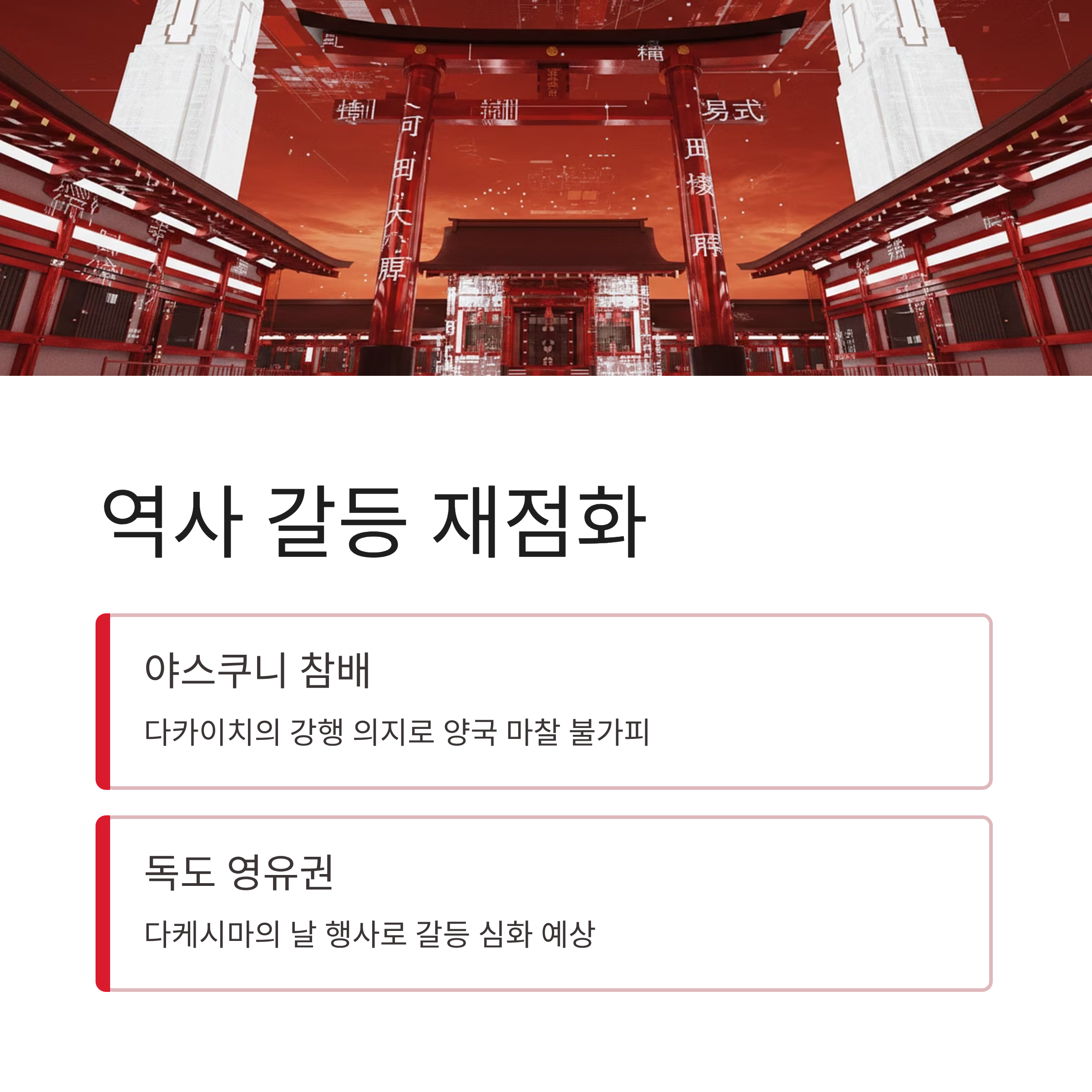 한일 갈등 재점화: 다카이치의 야스쿠니 신사 참배 강행 및 독도 영유권 주장 강화로 인해 역사 및 영토 문제에서 양국 간 마찰이 불가피합니다.