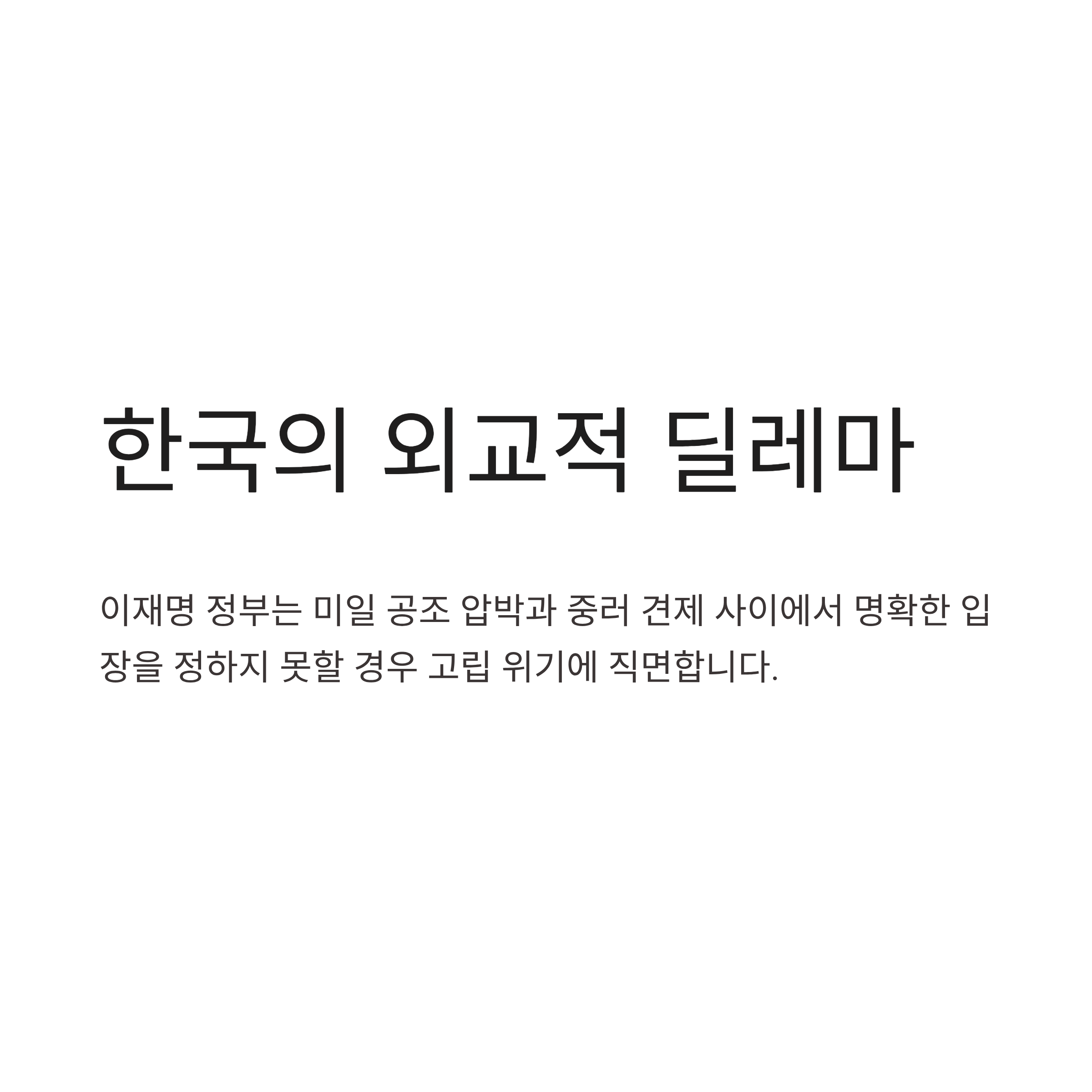 한국의 외교적 고립 심화: 이재명 정부의 실용 외교 노선이 시험대에 올랐습니다. 미일 공조 압박과 중국·러시아의 견제 사이에서 명확한 입장을 정하지 못할 경우 '샌드위치' 신세가 될 우려가 큽니다.