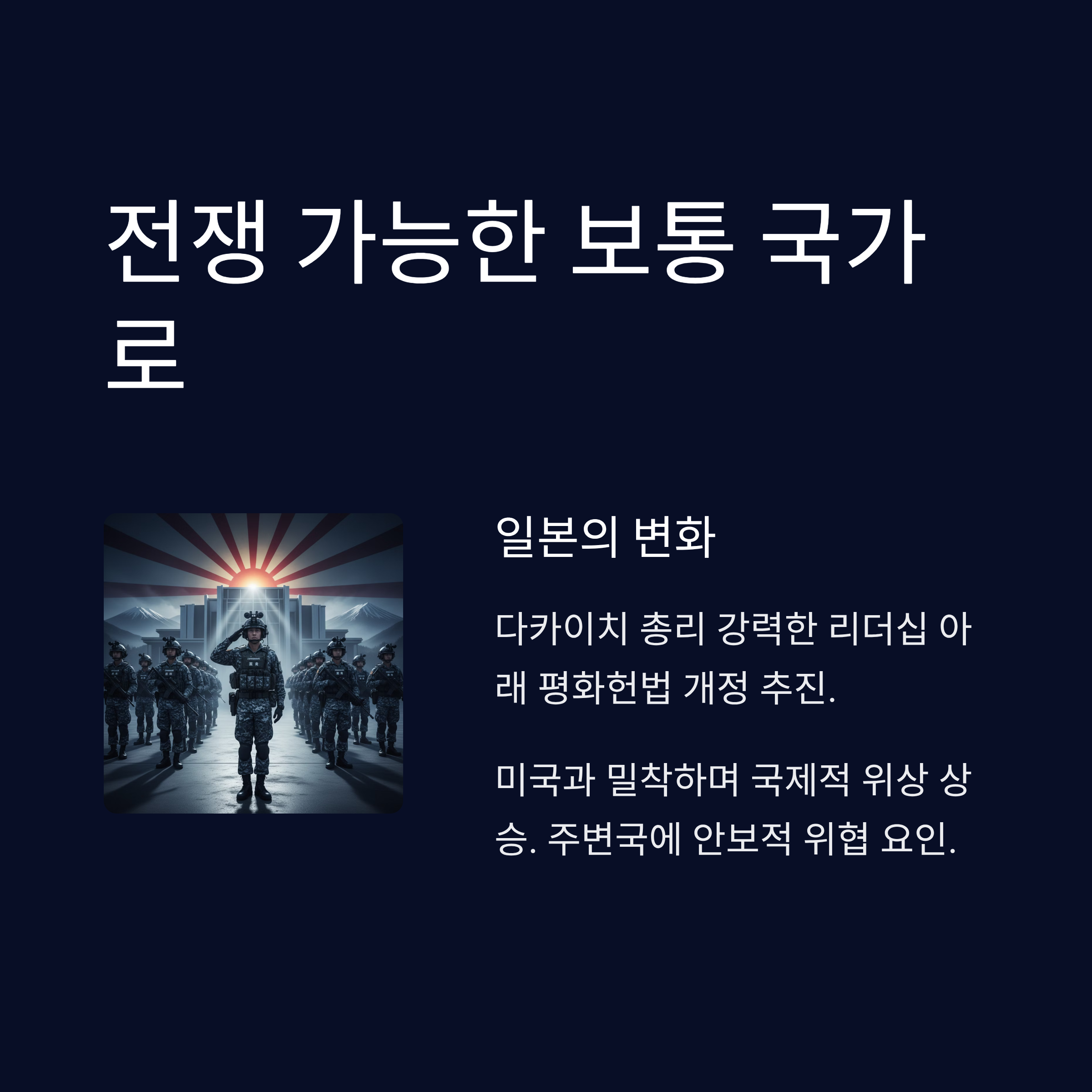 | 정책 추진 동력 | 중의원 3분의 2 이상 확보로 평화헌법 개정 및 방위비 증액 독주 체제 완성. |