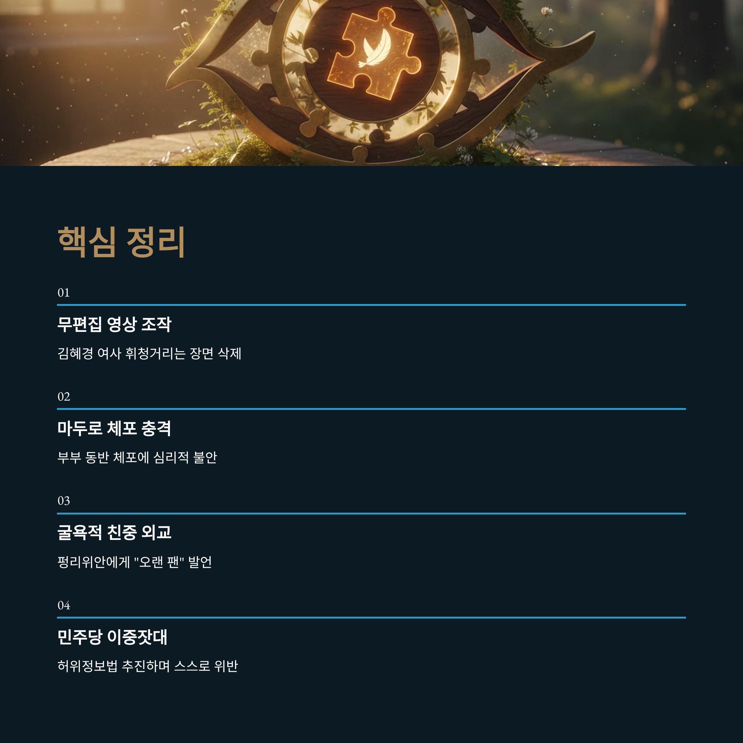 | A. '무편집 풀영상'이라고 여러 차례 강조했지만, 실제로는 김혜경 여사가 계단에서 휘청거리는 장면을 의도적으로 삭제한 명백한 편집 영상이었습니다. 이는 국민을 상대로 한 기만 행위로 볼 수 있습니다. |