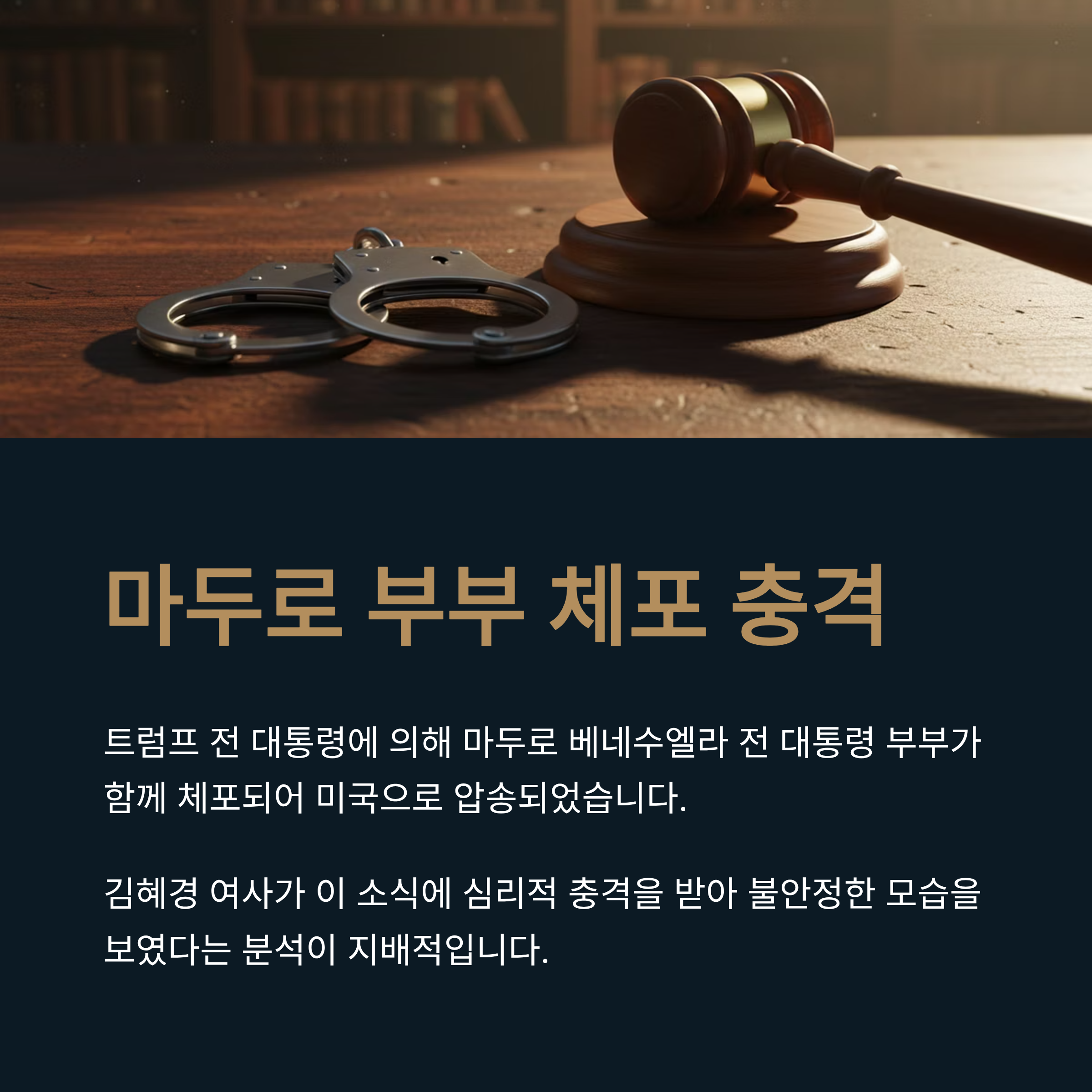 이 사건은 최근 마두로 부부가 함께 체포된 소식과 맞물려, 김 여사가 심리적 충격을 받은 것이 아니냐는 해석으로 이어지고 있습니다.