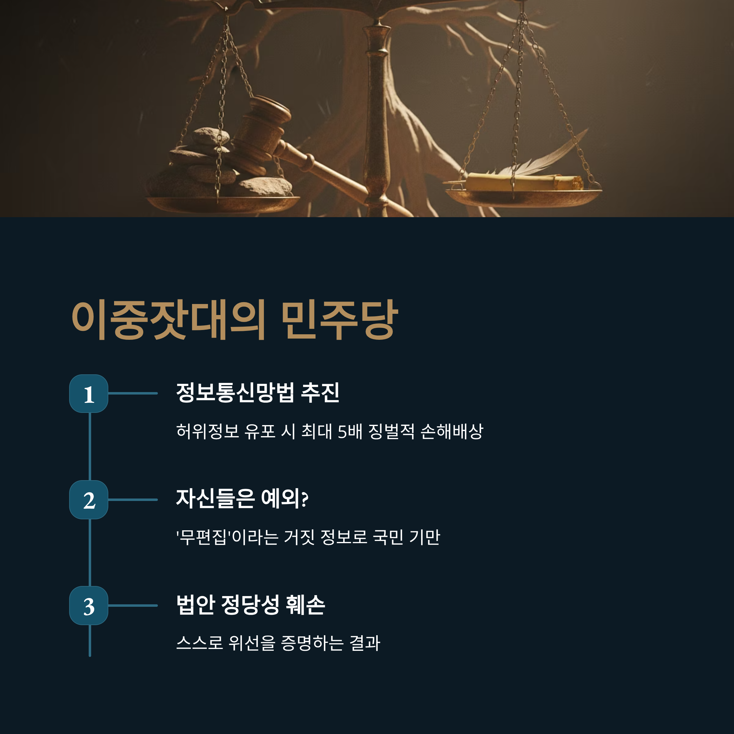 이 모든 논란은 허위정보 유포에 대한 강력한 처벌을 담은 정보통신망법을 추진하는 민주당의 이중잣대를 보여준다는 비판을 받고 있습니다.