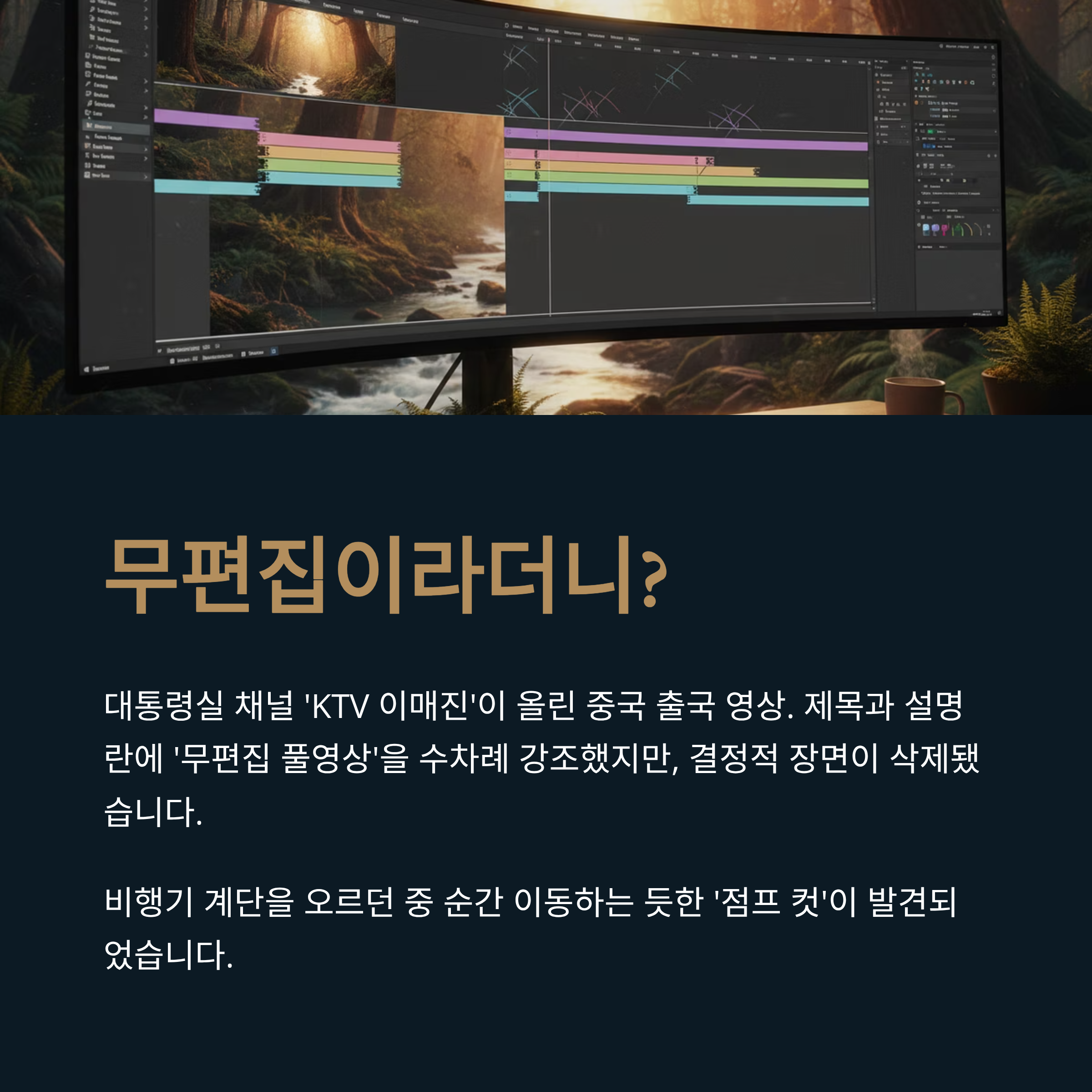 이재명 대통령 측의 공식 유튜브 채널 'KTV 이매진'은 중국 국빈 방문 출발 행사 영상을 업로드하며 제목과 설명란, 심지어 영상 상단에까지 '무편집 풀영상'임을 수차례 강조했습니다. 국민에게 모든 과정을 투명하게 공개하겠다는 의도로 보였지만, 영상에는 결정적인 편집점이 존재했습니다. 이 대통령 부부가 비행기 계단을 오르는 장면에서, 첫 계단을 밟은 직후 순식간에 계단 상단으로 순간 이동하는 듯한 '점프 컷'이 발견된 것입니다. 이는 명백한 편집의 증거이며, 자연스러운 영상의 흐름을 끊는 부자연스러운 장면입니다.