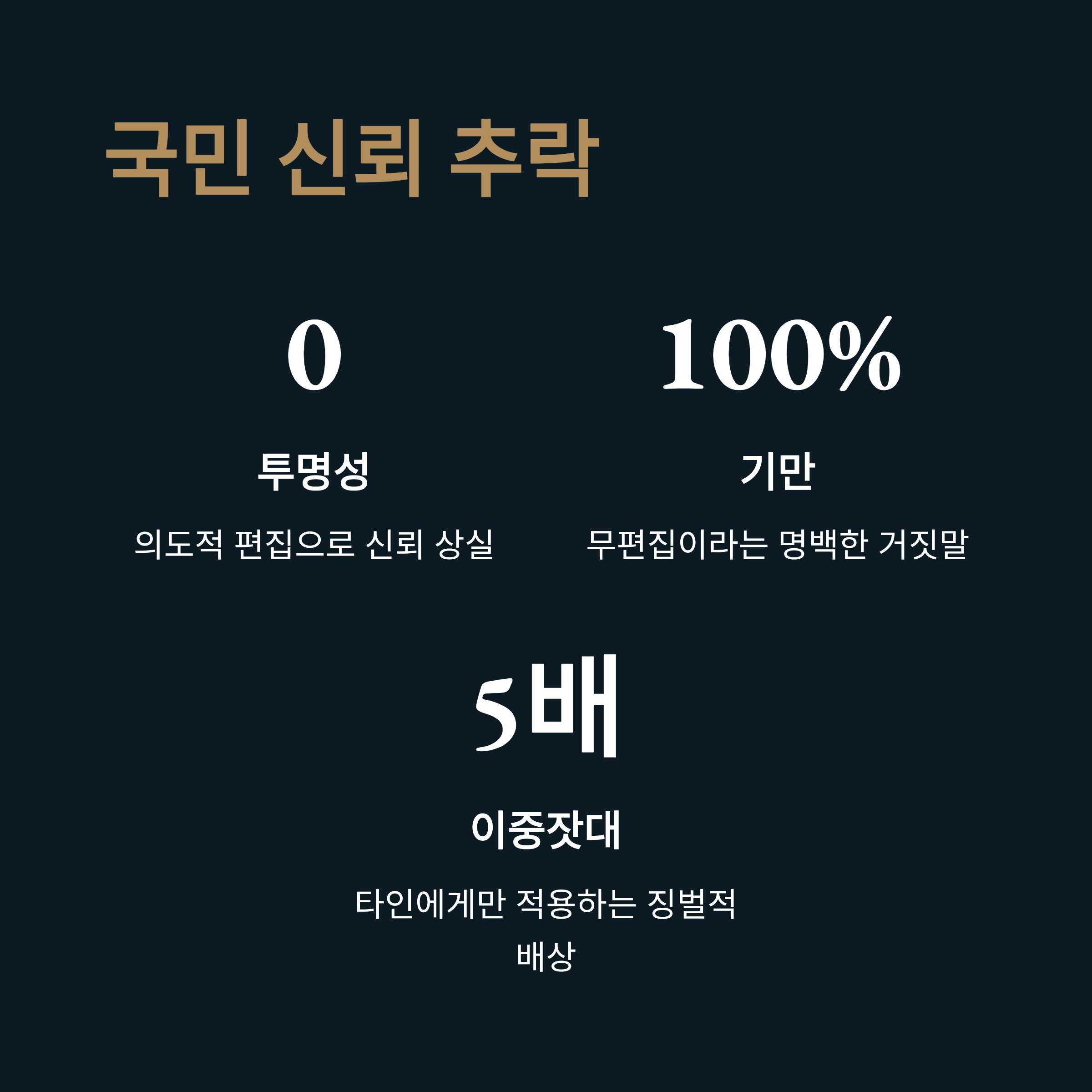 이러한 편집은 '무편집'이라고 명시하며 국민을 기만한 행위라는 비판을 피하기 어렵습니다. 특히 민주당이 허위 정보 유포 시 최대 5배의 징벌적 손해배상을 부과하는 정보통신망법 개정안을 강하게 밀어붙이는 상황과 맞물려 심각한 자기모순이자 위선이라는 지적이 나옵니다. 국민에게는 엄격한 잣대를 적용하려 하면서, 정작 자신들에게 불리한 장면은 의도적으로 잘라내고 '무편집'이라는 거짓 정보로 포장한 셈입니다. 이는 법안의 정당성을 스스로 훼손하는 행위이며, 공적 기록물에 대한 신뢰도를 떨어뜨리는 심각한 문제로 볼 수 있습니다.