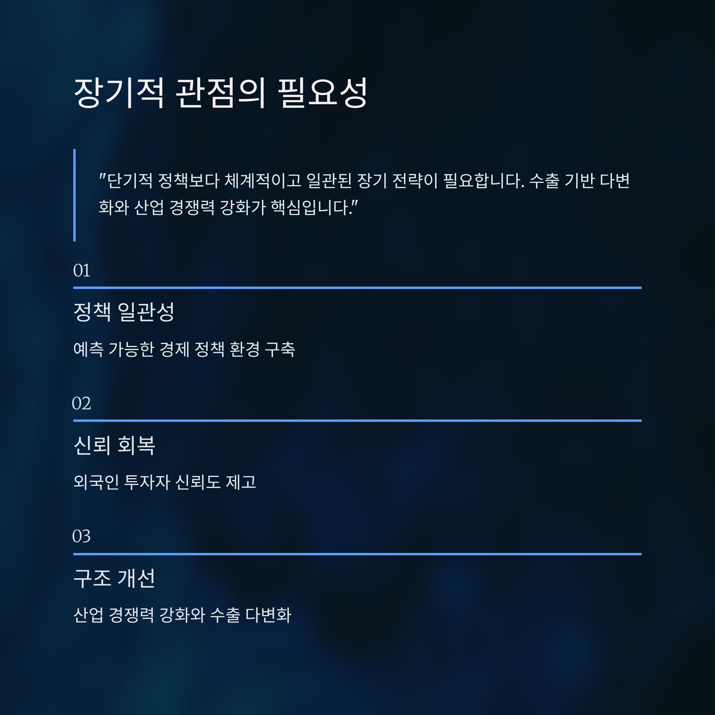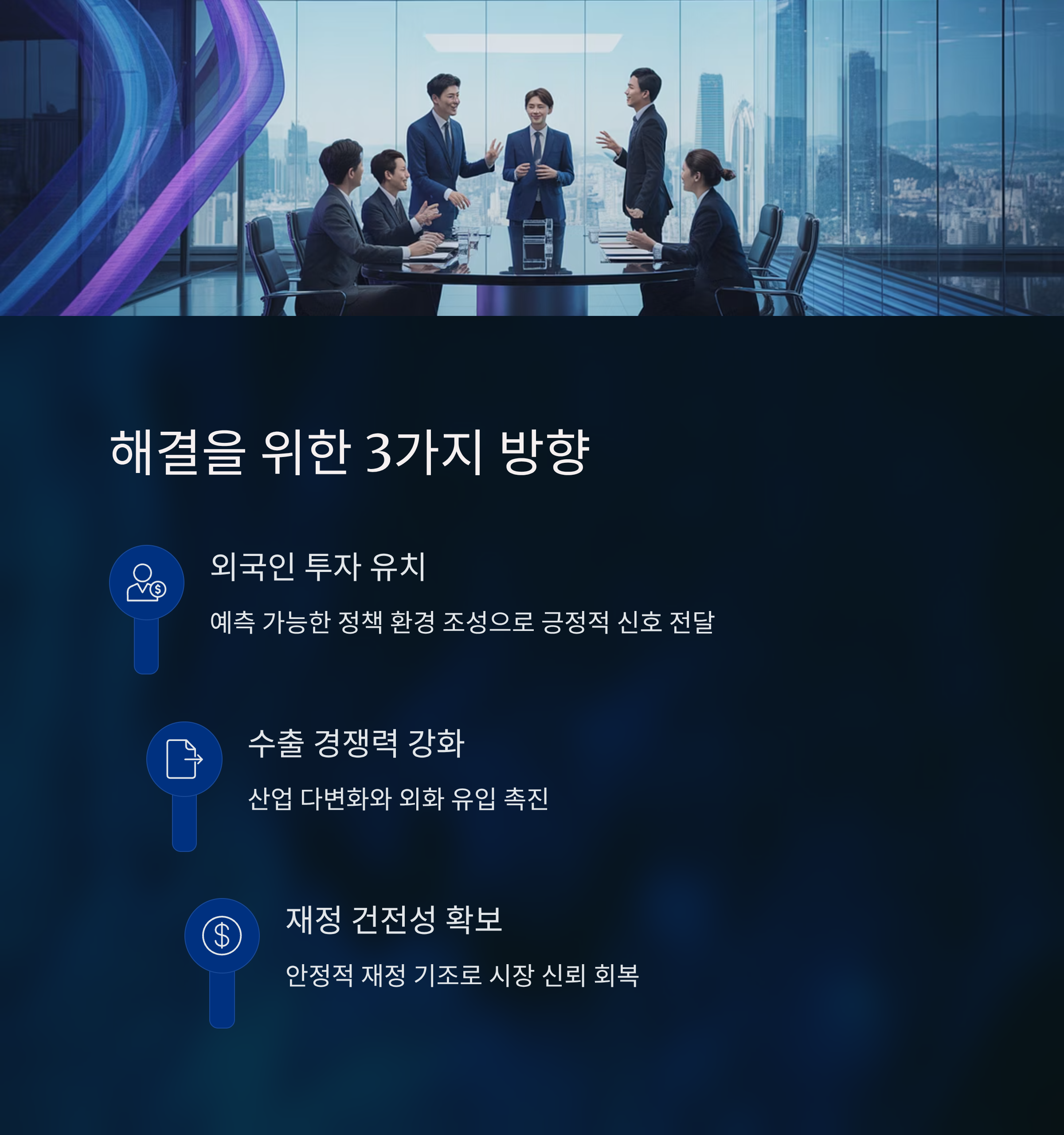 향후 이 문제를 해결하기 위해서는 단기적인 정책보다 장기적인 관점에서 체계적이고 일관된 전략을 마련해야 합니다. 정부는 예측 가능한 정책 환경과 안정적인 재정 기조를 통해 외국인 투자자들에게 긍정적인 신호를 줄 필요가 있습니다. 더불어 수출 기반을 다변화하고 산업 경쟁력을 강화하는 노력이 중요할 것입니다.
