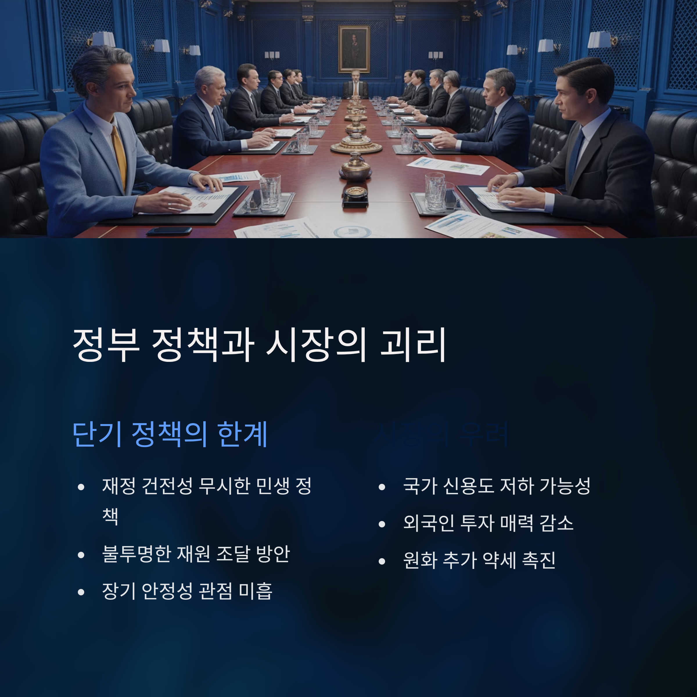 재정 건전성을 무시한 단기적인 민생 정책은 환율 안정화에 한계가 있음을 보여줍니다. 정부가 도입한 각종 지원책과 소비 진작책은 단기적 효과를 거둘 수 있지만, 재원 조달 방안이 불투명하거나 장기적인 경제 안정성 관점에서 미흡하다는 평가를 받고 있습니다.