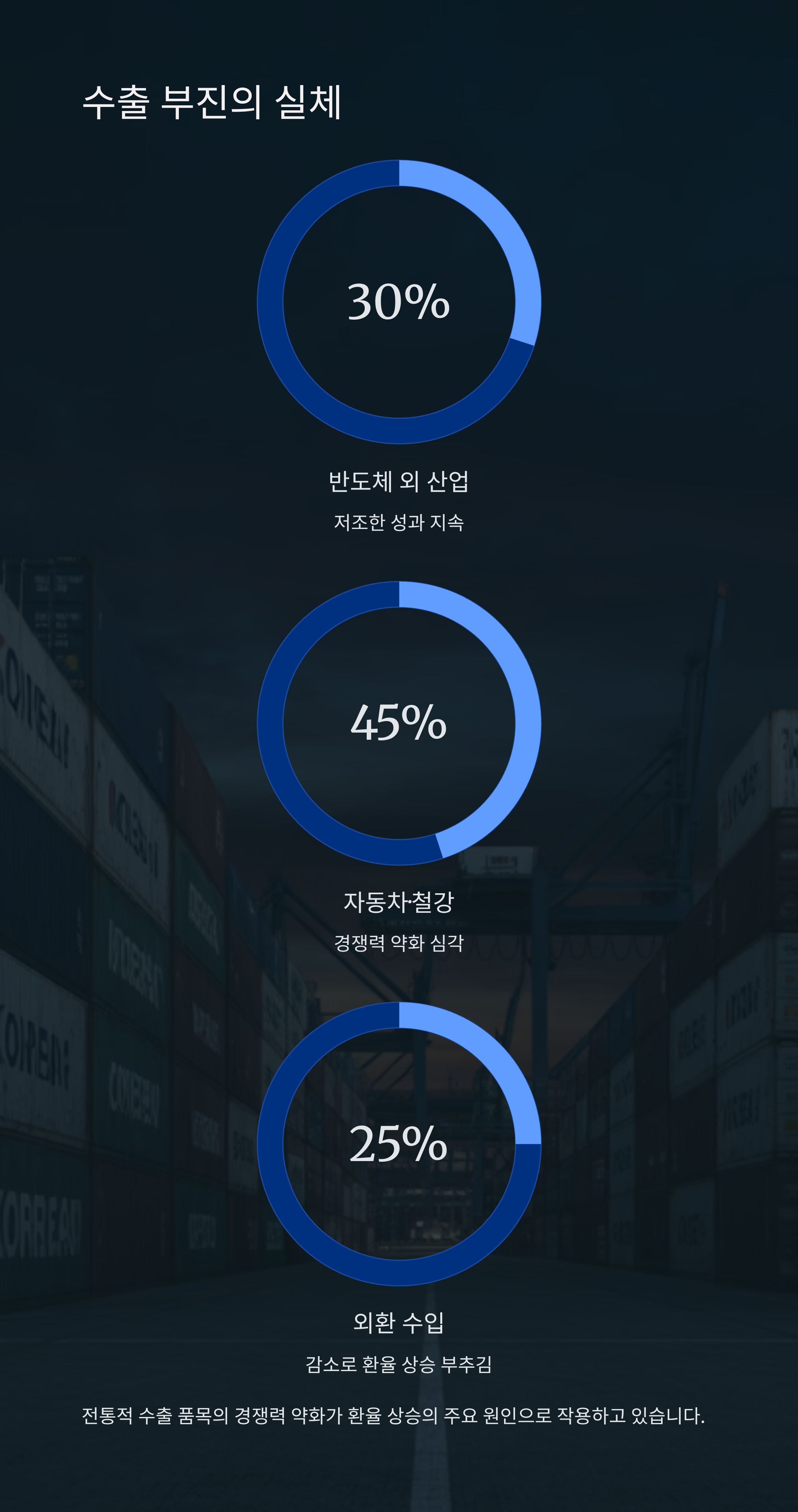 한국 경제의 강점이었던 수출 분야는 일부 회복 조짐을 보이긴 하지만, 반도체 외 다른 주요 산업에서는 저조한 성과가 이어지고 있습니다. 특히, 자동차 및 철강과 같은 전통적인 수출 품목의 경쟁력 약화는 외환 수입 감소로 이어지며 환율 상승을 부추기는 주요 원인으로 작용하고 있습니다.