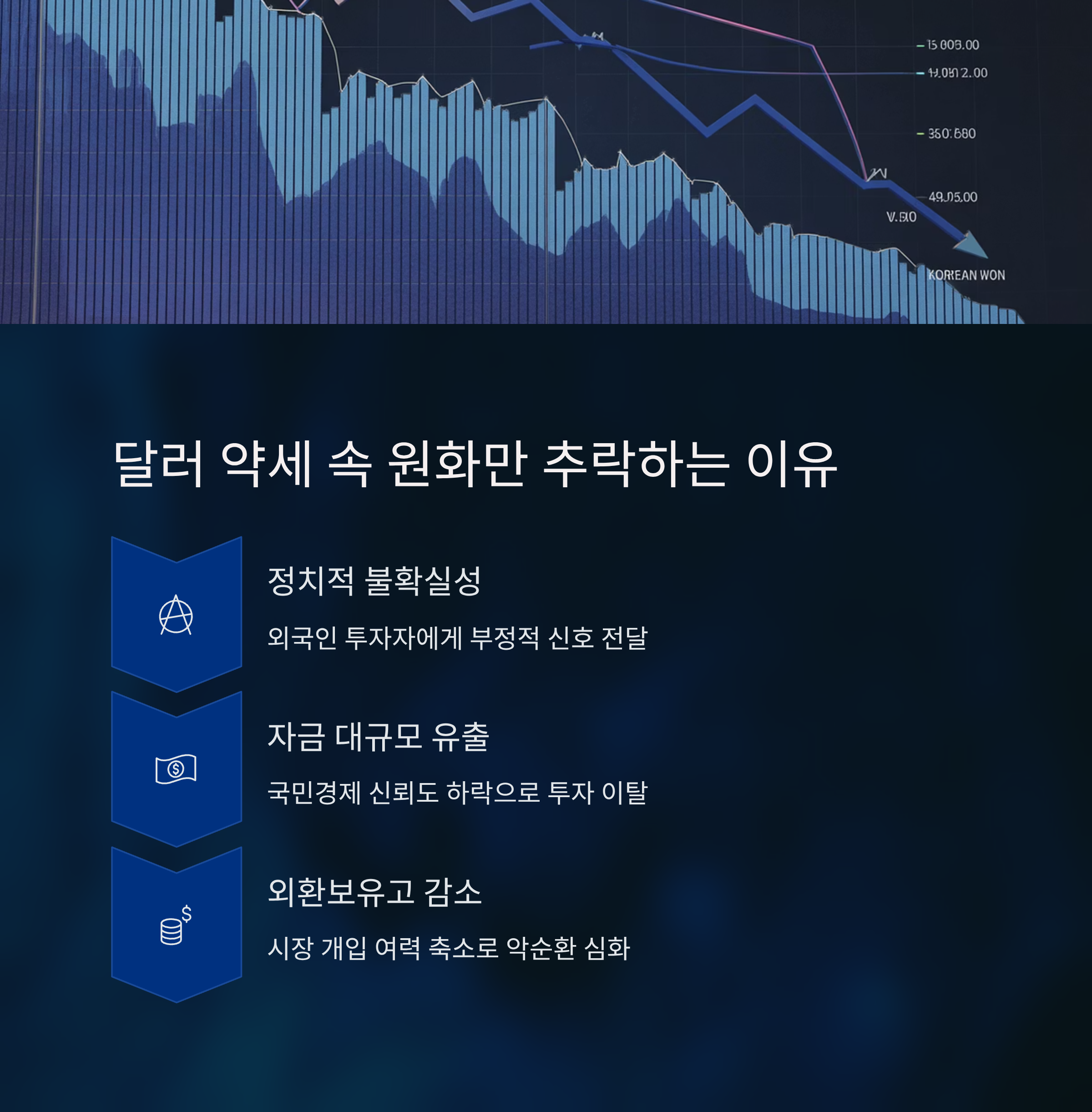| A. 이는 국내 요인인 정치적 불확실성과 재정 건전성 악화가 주요 원인으로 작용하기 때문입니다. 외국인 투자 자금의 유출도 큰 영향을 미칩니다. |