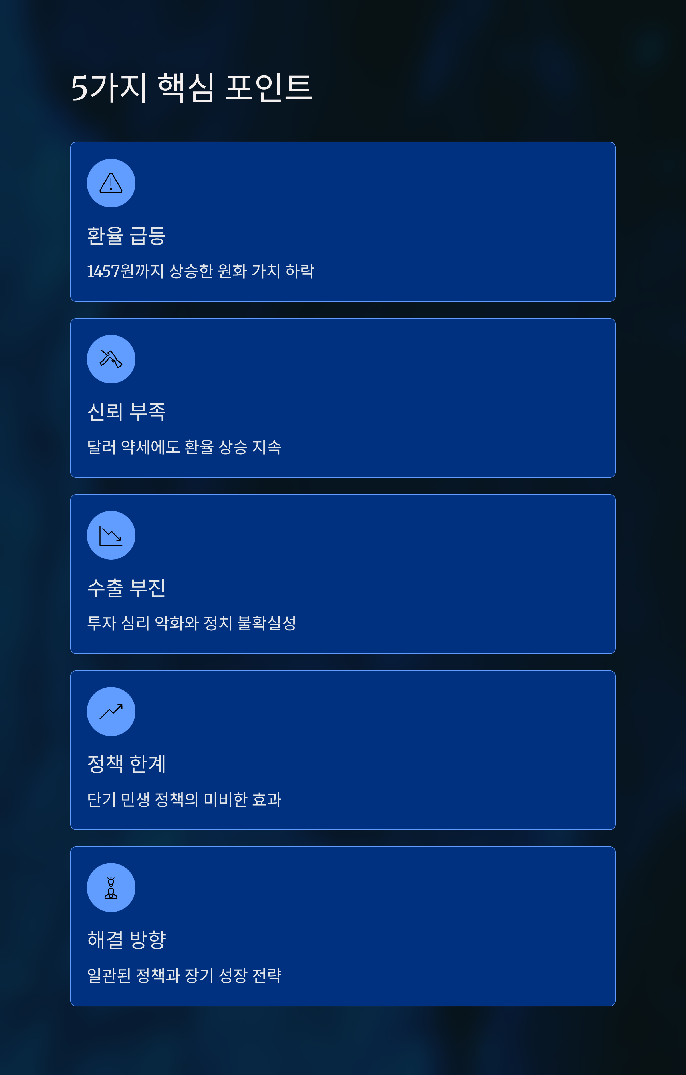 원달러 환율이 1457원이라는 급등세를 보이며 한국 경제가 금융 시장에서 신뢰를 잃고 있는 현실을 반영하고 있습니다. 이는 단순히 외부적 요인에 기인한 것이 아니라, 내부적인 정책 신뢰 부족과 구조적 경제 문제에서 비롯된 것임을 명확히 해야 합니다.