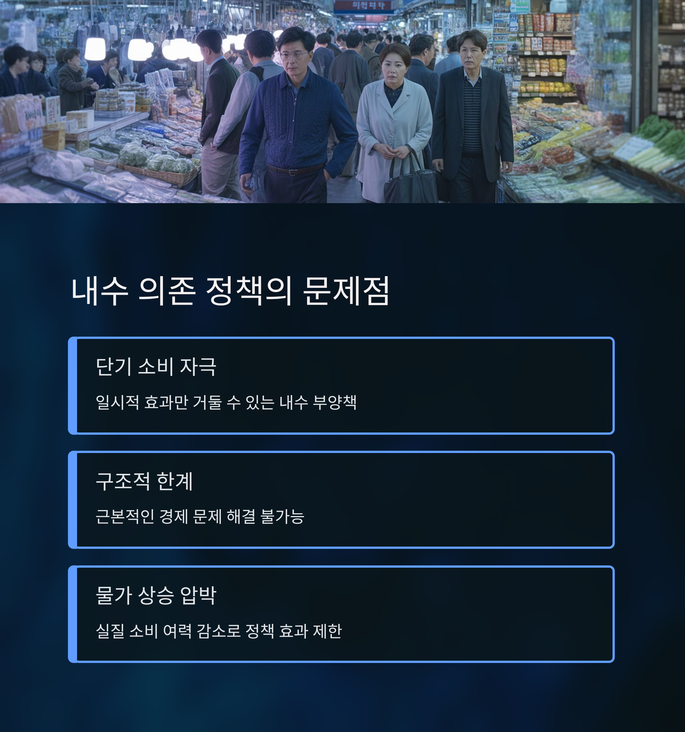 내수 부양 정책은 단기간 국민 소비를 자극할 수 있으나, 구조적인 경제 문제를 해결하지 못한다는 한계가 있습니다. 물가 상승으로 인해 실질적인 소비 여력이 감소하는 상황에서, 이러한 정책의 효과는 더욱 제한적일 수 있습니다.