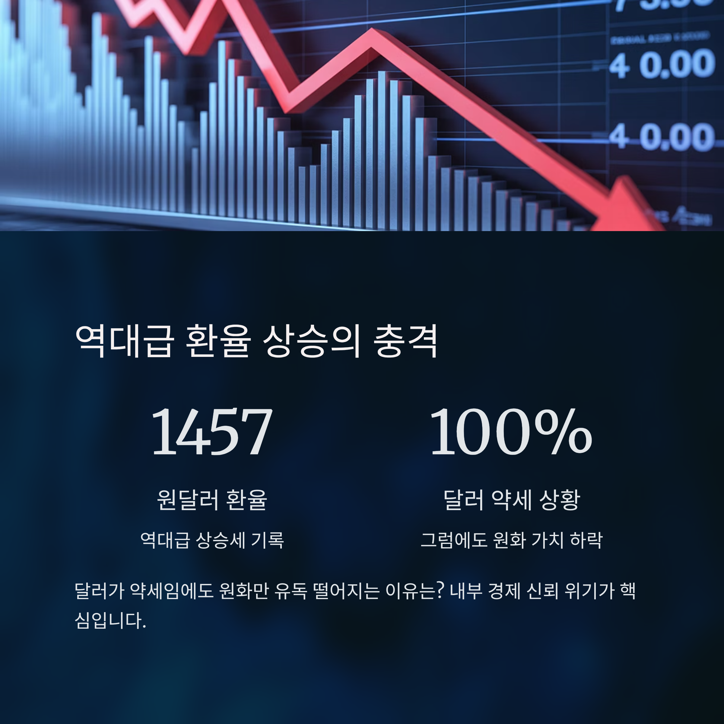 2023년 한국 경제는 전환점에 서 있습니다. 원달러 환율이 1457원을 기록하며 역대급 상승세를 보이는 가운데, 원화의 가치 하락은 국내외 시장에서 심각한 신호로 받아들여지고 있습니다. 특히 달러가 약세 상태임에도 불구하고 원화 가치가 하락하고 있는 상황은 내부 경제적 문제에서 비롯된 신뢰 위기의 한 단면으로 분석되고 있습니다.