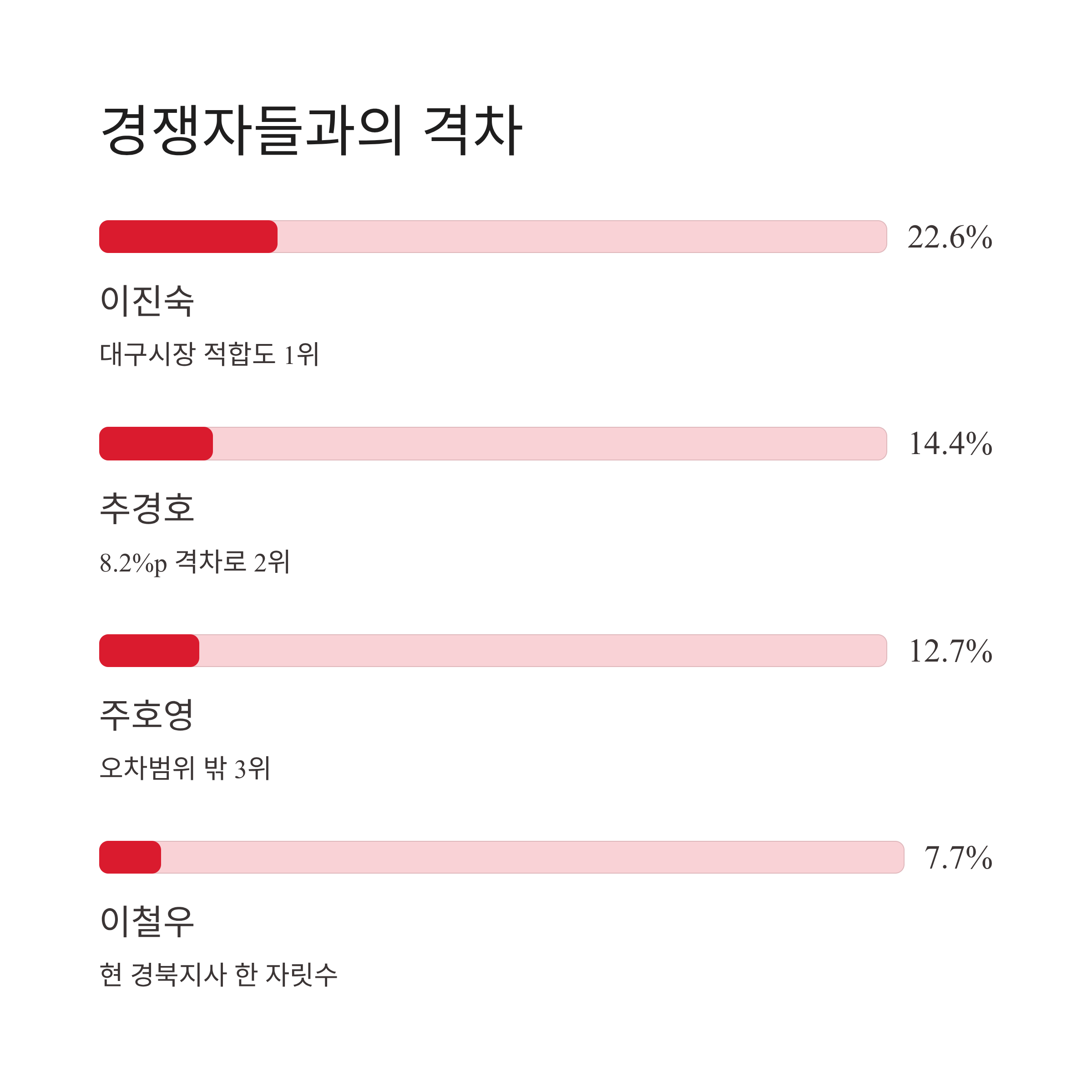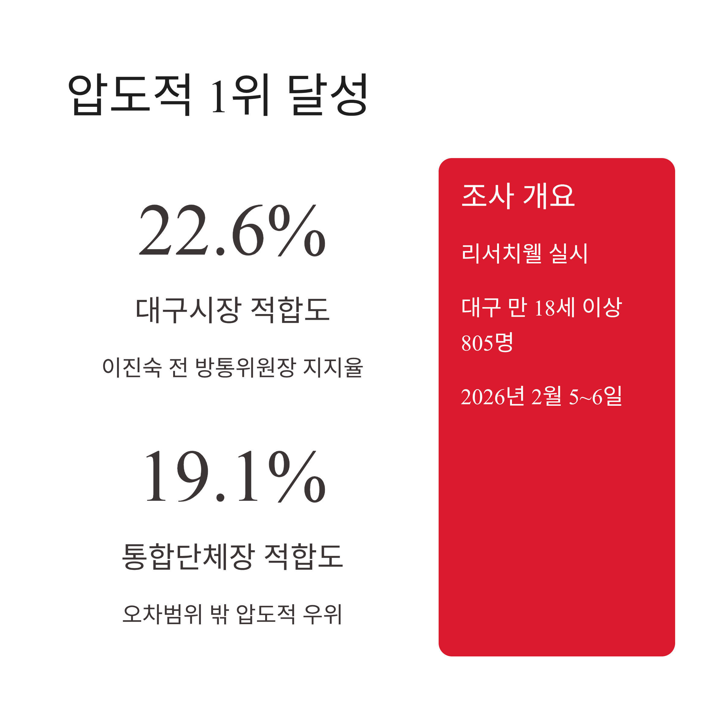 | 대구시장 적합도 | 이진숙 (22.6%) | 추경호 (14.4%), 주호영 (12.7%) | 8.2%p 우위 (오차범위 밖) |