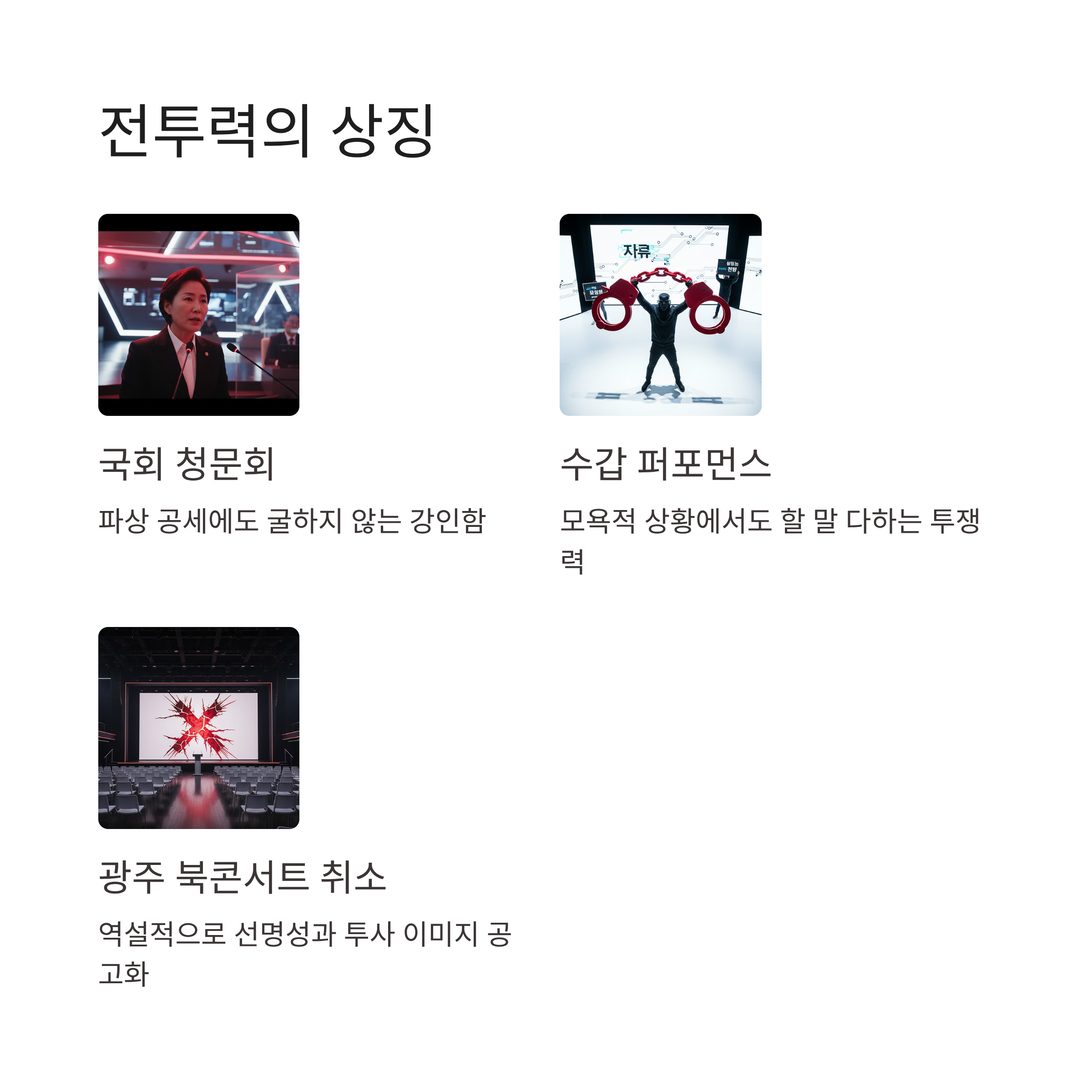 이진숙 현상의 기저에는 국민의힘 지도부에 대한 깊은 실망감이 자리 잡고 있습니다. 이재명 대통령과 거대 여당의 일방적인 국정 운영 속에서 장동혁 대표 체제의 국민의힘이 제대로 된 저항조차 하지 못한다는 '웰빙 정당', '무기력 정당'이라는 비판이 TK 지역에서 비등하고 있습니다. 이러한 상황에서 유권자들은 과거 방송통신위원장 청문회와 국회 과학기술정보방송통신위원회에서 야당의 파상 공세에 한 치도 물러서지 않고 싸웠던 이진숙 전 위원장의 '전투력'에 열광하고 있습니다. 점잖고 스펙 좋은 명망가형 정치인이 아니라, 수갑을 차는 퍼포먼스를 불사하고 모욕적인 상황에서도 할 말을 다 하는 강한 투쟁력이 보수 지지층의 억눌린 분노를 해소하며 강력한 카타르시스를 제공했습니다. 특히 광주에서의 북콘서트가 진보 진영의 반발로 무산된 사건은 역설적으로 보수층 내에서 그녀의 선명성과 투사 이미지를 더욱 공고히 하는 계기가 되었습니다.