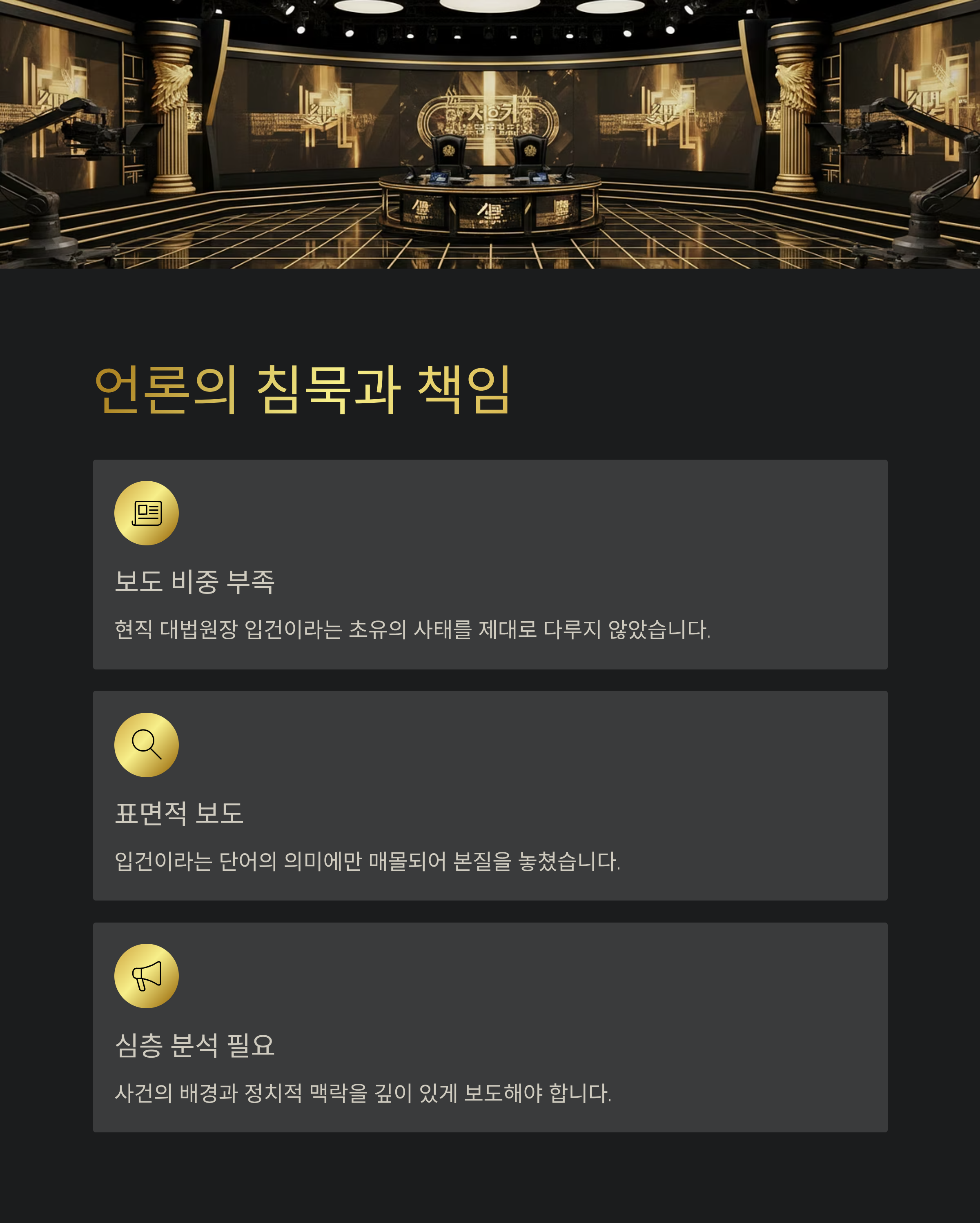 언론의 역할 논란: 일부 언론이 현직 대법원장 입건이라는 초유의 사태를 비중 있게 다루지 않아 비판이 일고 있습니다.