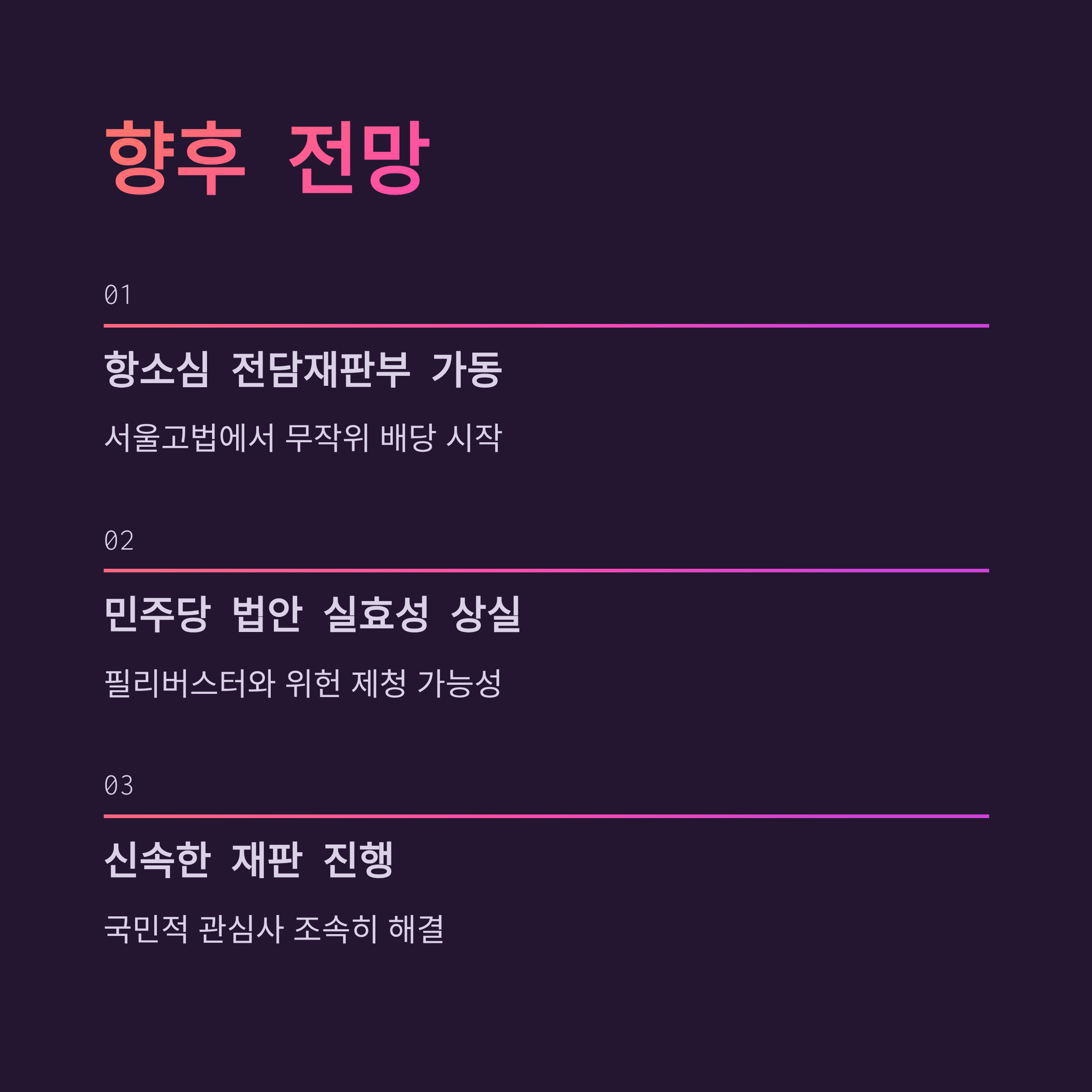 하지만 대법원의 예규 제정으로 인해 민주당의 입법 명분은 상당히 약화되었습니다. 사법부가 이미 '신속하고 공정한 재판'을 위한 시스템을 자체적으로 마련했기 때문입니다. 민주당 입장에서 법안을 강행할 경우, 사법부의 독립성을 훼손한다는 역풍을 맞을 수 있습니다. 또한, 이미 대법원 예규에 따라 서울고등법원에서 항소심 준비가 진행될 경우, 뒤늦게 통과된 법안이 소급 적용되기 어렵거나 법적 혼란만 가중시킬 수 있습니다. 이는 민주당이 의도했던 방향이 대법원의 '법적 원칙론'에 의해 무력화된 형국으로, 닭 쫓던 개 지붕 쳐다보는 격이 될 수 있습니다.