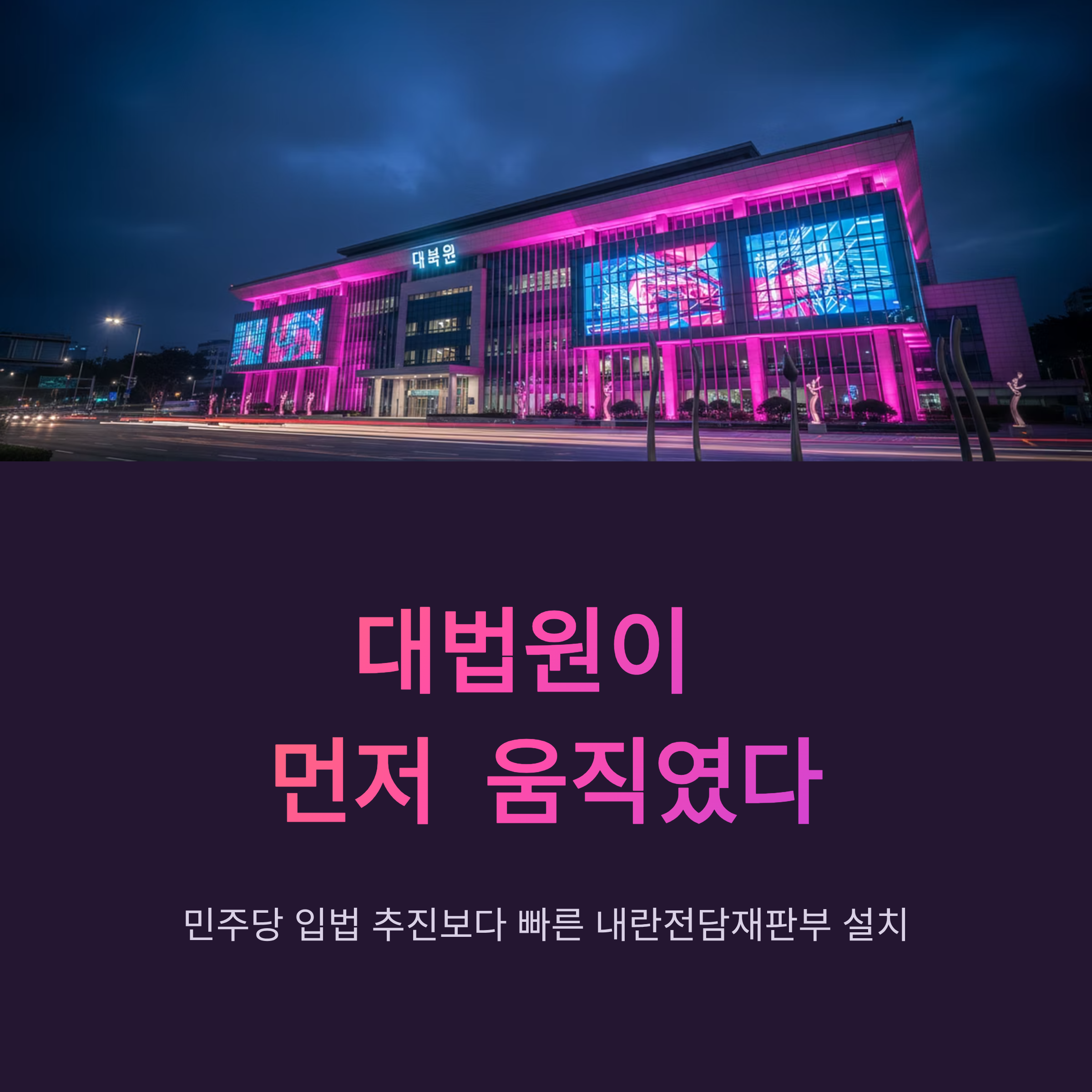 이번 대법원의 내란 전담 재판부 예규 제정은 사법부가 정치권의 외풍으로부터 재판의 독립성을 지키겠다는 강력한 메시지이자 실질적인 행동입니다. 더불어민주당이 추진하던 특별법은 '특정 재판부 구성'이라는 위헌적 소지로 인해 자칫 재판 전체를 멈춰 세울 위험이 있었습니다. 반면, 대법원의 조치는 기존 헌법과 법률의 테두리 안에서 '무작위 배당'이라는 공정성의 가치를 지키면서도 '전담 재판'이라는 효율성을 확보한 묘수입니다. 이는 사법부가 국회보다 한발 앞서 국민의 우려를 해소하고 재판의 정당성을 확보하려는 노력으로 평가받을 수 있습니다.