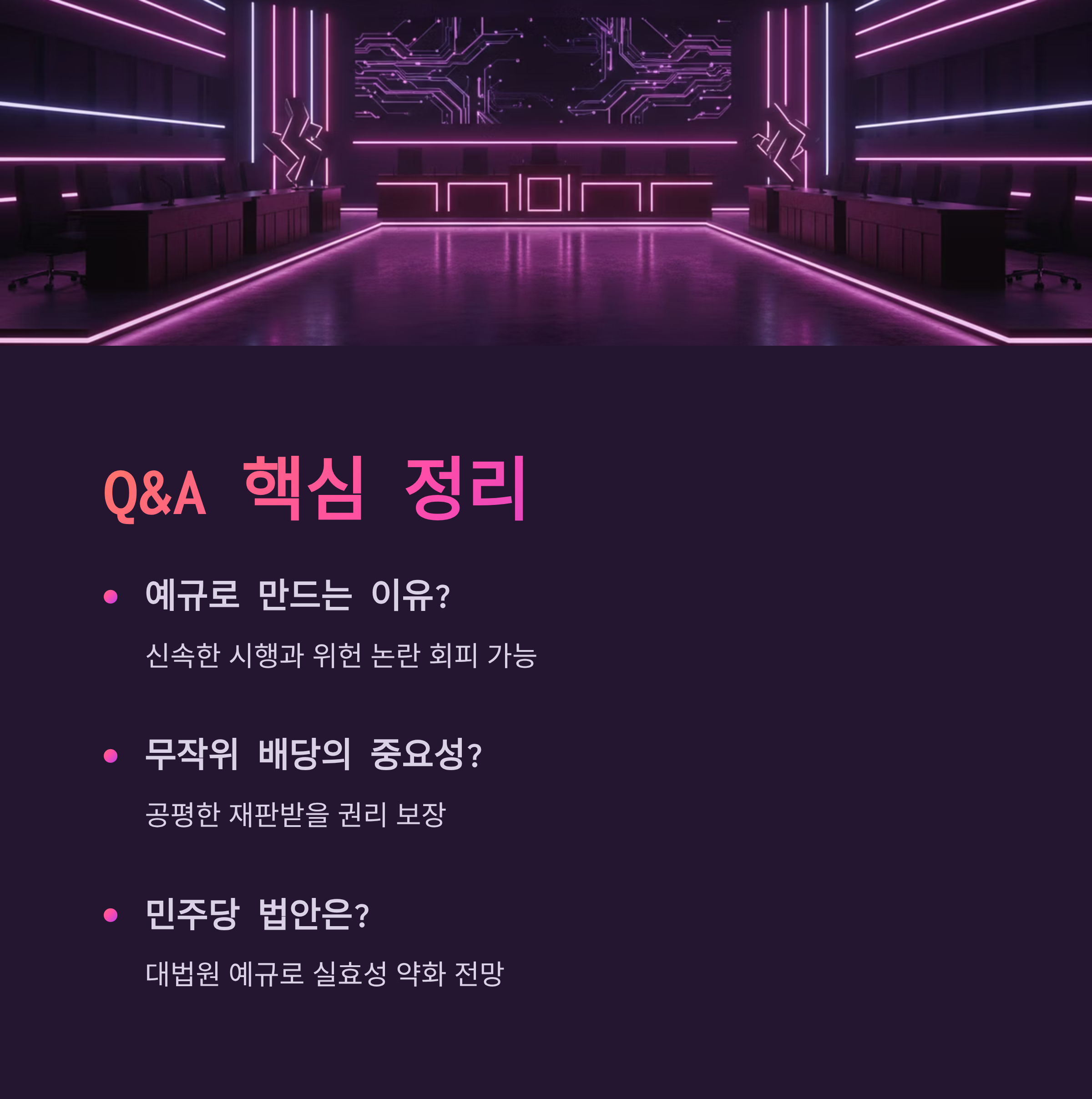 | A. 국회에서 법률을 만들면 통과 과정에 시간이 걸리고 위헌 시비가 붙을 경우 재판이 중단될 위험이 있습니다. 반면 대법원 예규는 사법부 내부 행정 규칙으로, 10일간의 예고 기간만 거치면 즉시 시행할 수 있어 신속한 재판부 설치가 가능하기 때문입니다. 또한 기존의 무작위 배당 원칙을 유지하여 공정성 논란을 피할 수 있습니다. |