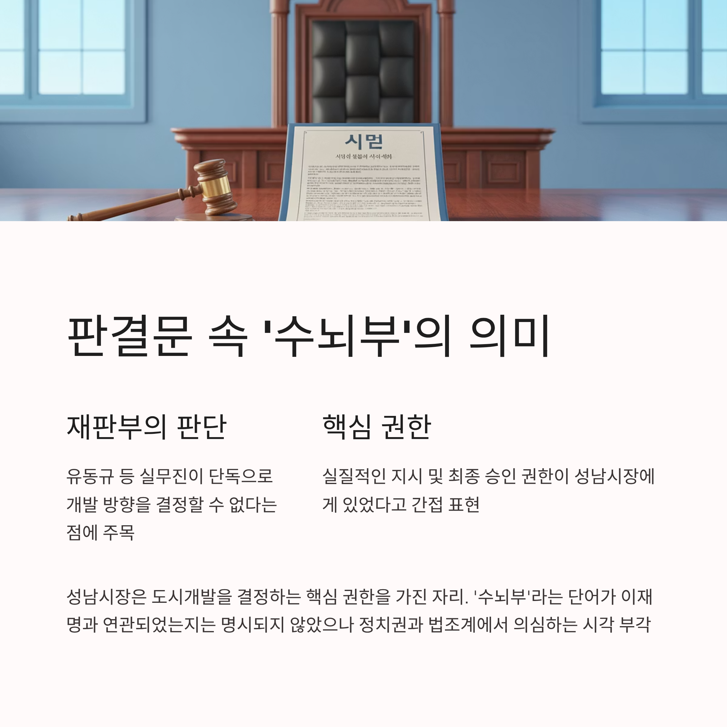 대장동 사건의 재판부 판결문에 등장한 '수뇌부'는 사건의 중심 인물을 암시하는 표현입니다. 해당 사건에서 성남시장은 도시개발을 결정하는 핵심 권한을 가진 자리에 있었습니다. 재판부는 유동규 등 실무진이 단독으로 개발 방향을 결정할 수 없다는 점에 주목하며, 실질적인 지시 및 최종 승인 권한이 '수뇌부'로 묘사된 성남시장에게 있었다고 간접적으로 표현했습니다.