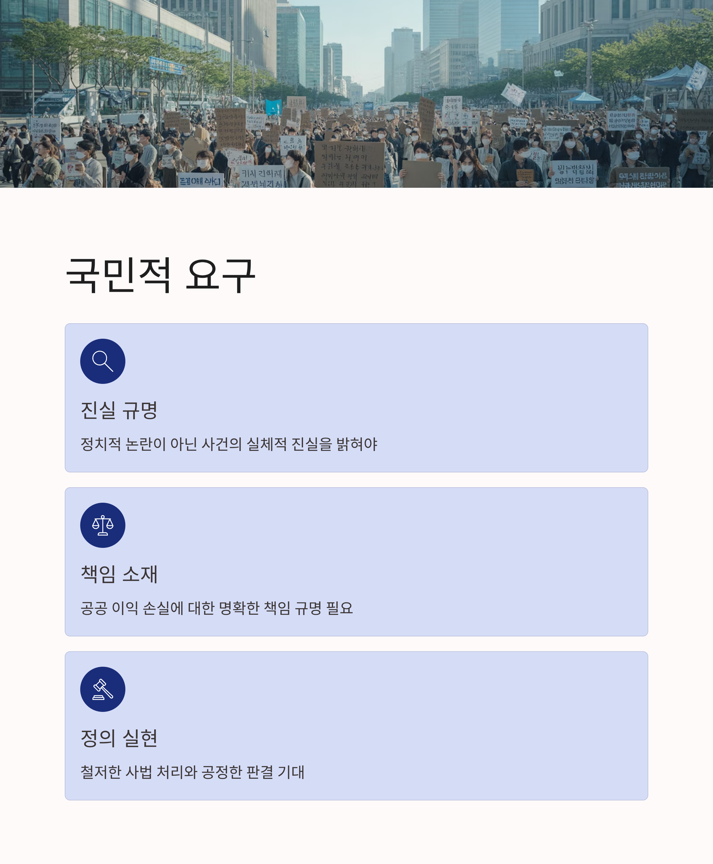 - 국민적 요구는 철저한 진상 규명과 책임 있는 사법 처리.