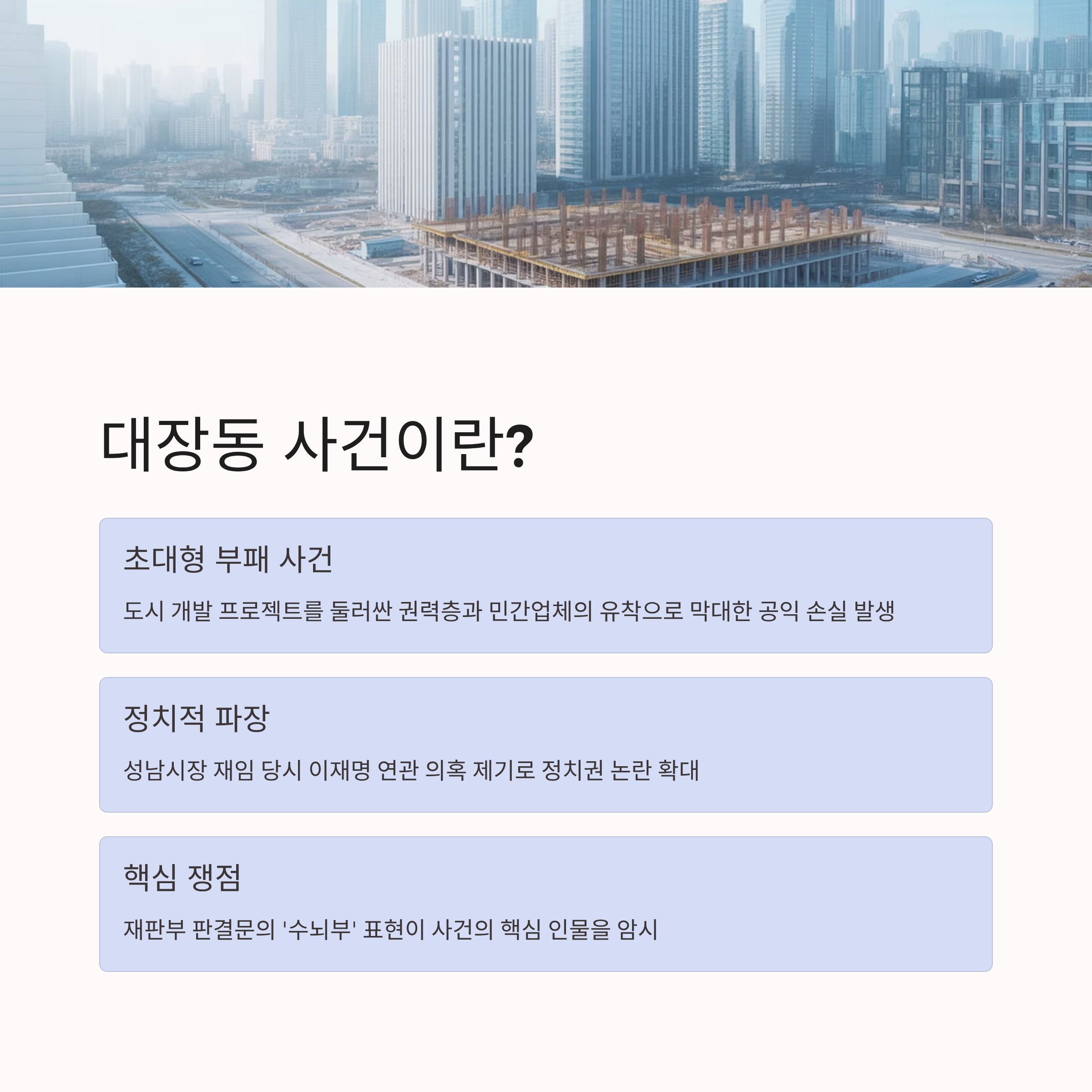 대장동 사건은 최근 한국 사회에서 가장 큰 화두로 떠오르며 정치적, 사회적으로 많은 논란을 빚고 있는 부패 사건입니다. 이 사건은 초대형 도시 개발 프로젝트를 둘러싼 권력층과 민간업체의 유착 관계를 중심으로 막대한 공익 손실이 발생한 것으로 의심됩니다. 특히 성남시장 재임 당시 이재명이 연관되었다는 의혹이 제기되며 정치적 파장이 확대되고 있습니다. 재판부의 판결문에서 언급된 '수뇌부'라는 단어가 사건의 핵심적 인물을 암시한다고 해석되면서 이와 관련된 논의가 더욱 뜨겁게 진행되고 있습니다.