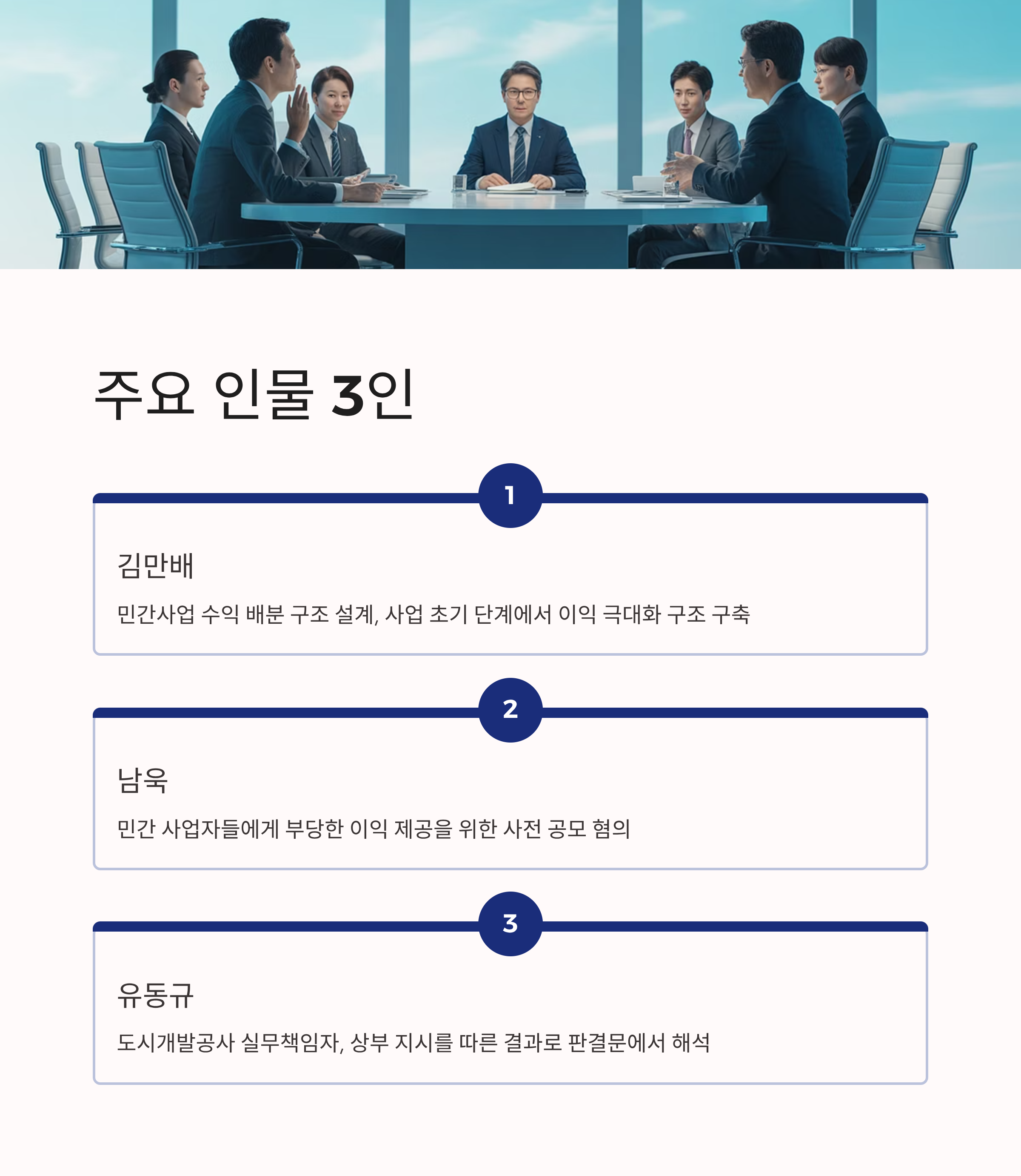 대장동 사건에서 등장하는 인물들 가운데 유동규, 김만배, 남욱 등이 핵심 역할을 수행했으며, 재판 과정에서 이들의 행위가 민간 사업자들에게 부당한 이익을 제공하기 위한 사전 공모였다는 판단이 제시되었습니다. 김만배와 남욱은 사업 초기 단계에서 민간사업 수익 배분을 통해 자신들의 이익을 극대화할 수 있는 구조를 설계한 것으로 드러났습니다.