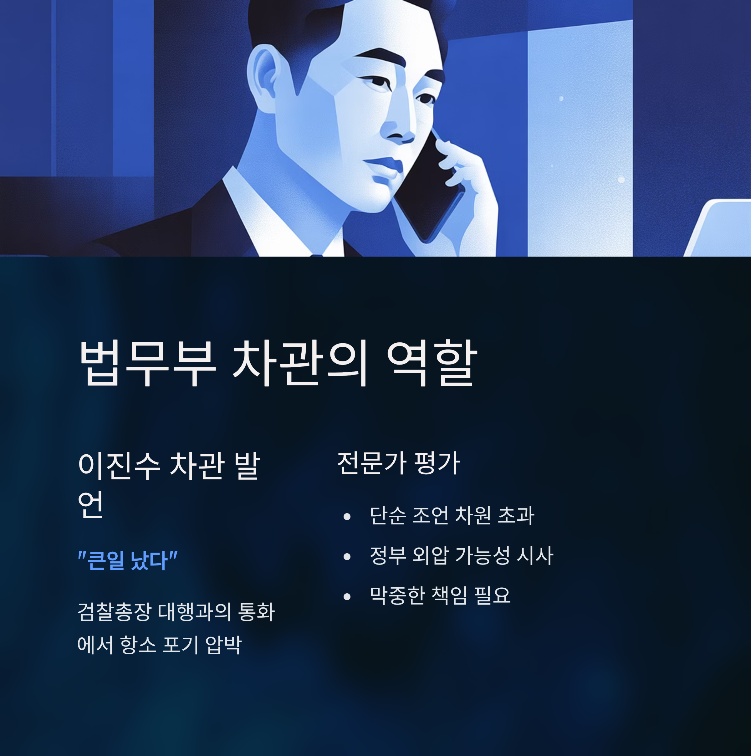 이진수 법무부 차관의 능동적 역할이 대장동 사건의 항소 포기 결정에 중요한 변수로 작용한 것으로 평가되고 있습니다. 차관이 검찰총장 직무 대행과의 통화에서 '큰일 났다'라는 발언을 했다는 점은, 행정부가 검찰의 독립성을 침해했다는 의혹을 불러일으켰습니다. 해당 발언 이후 항소 포기가 실제로 결정되었기에, 이 사건은 단순한 차관의 조언 차원을 넘어 정부 외압 가능성을 시사합니다.