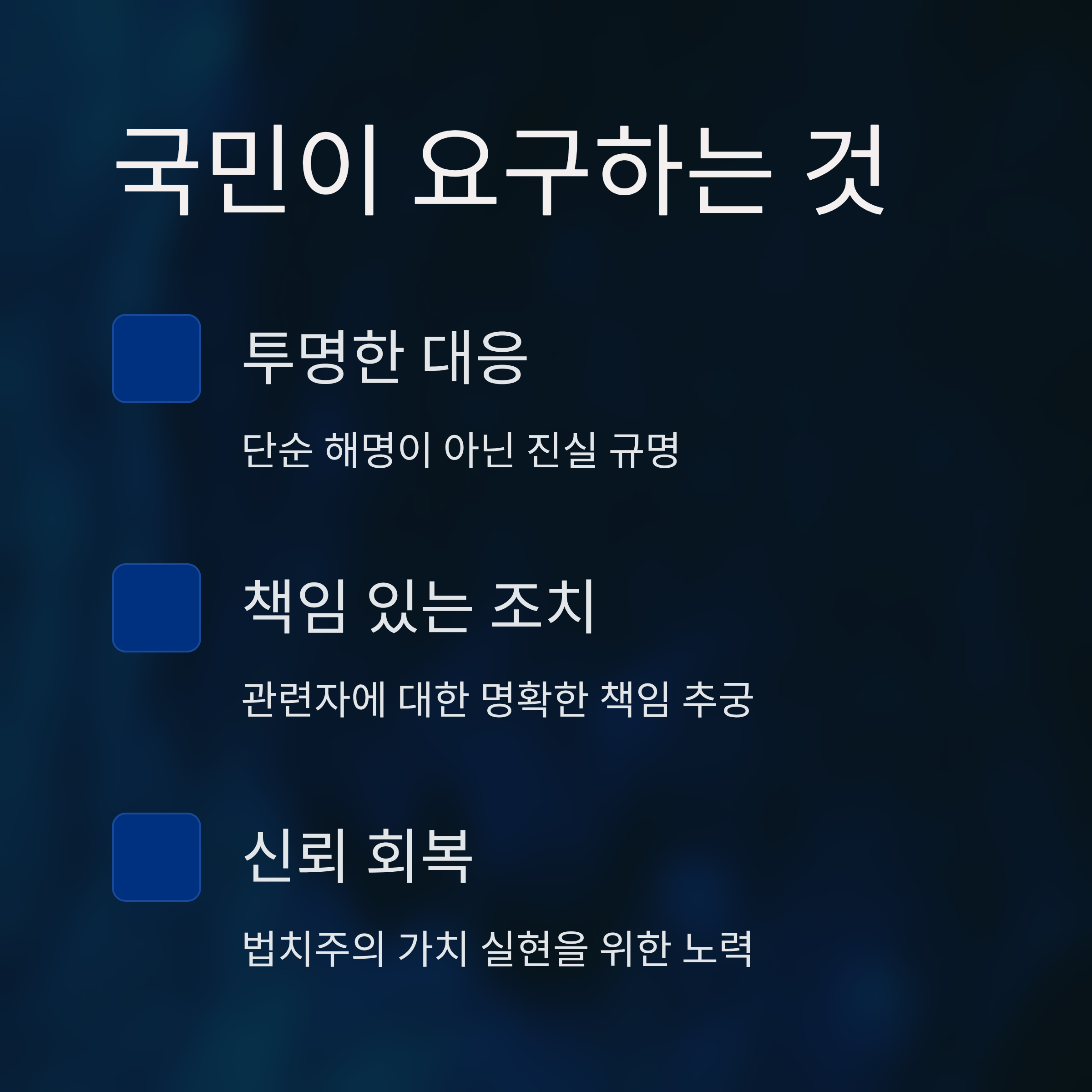 이러한 일련의 과정 속에서 국민이 요구하는 것은 단순한 해명이 아닌, 투명하고 책임 있는 대응입니다. 신뢰 회복과 정의 구현에 초점을 맞춘 대응이 향후 우리 사회의 법치주의를 더욱 강하게 만들어 나갈 열쇠가 될 것입니다.
