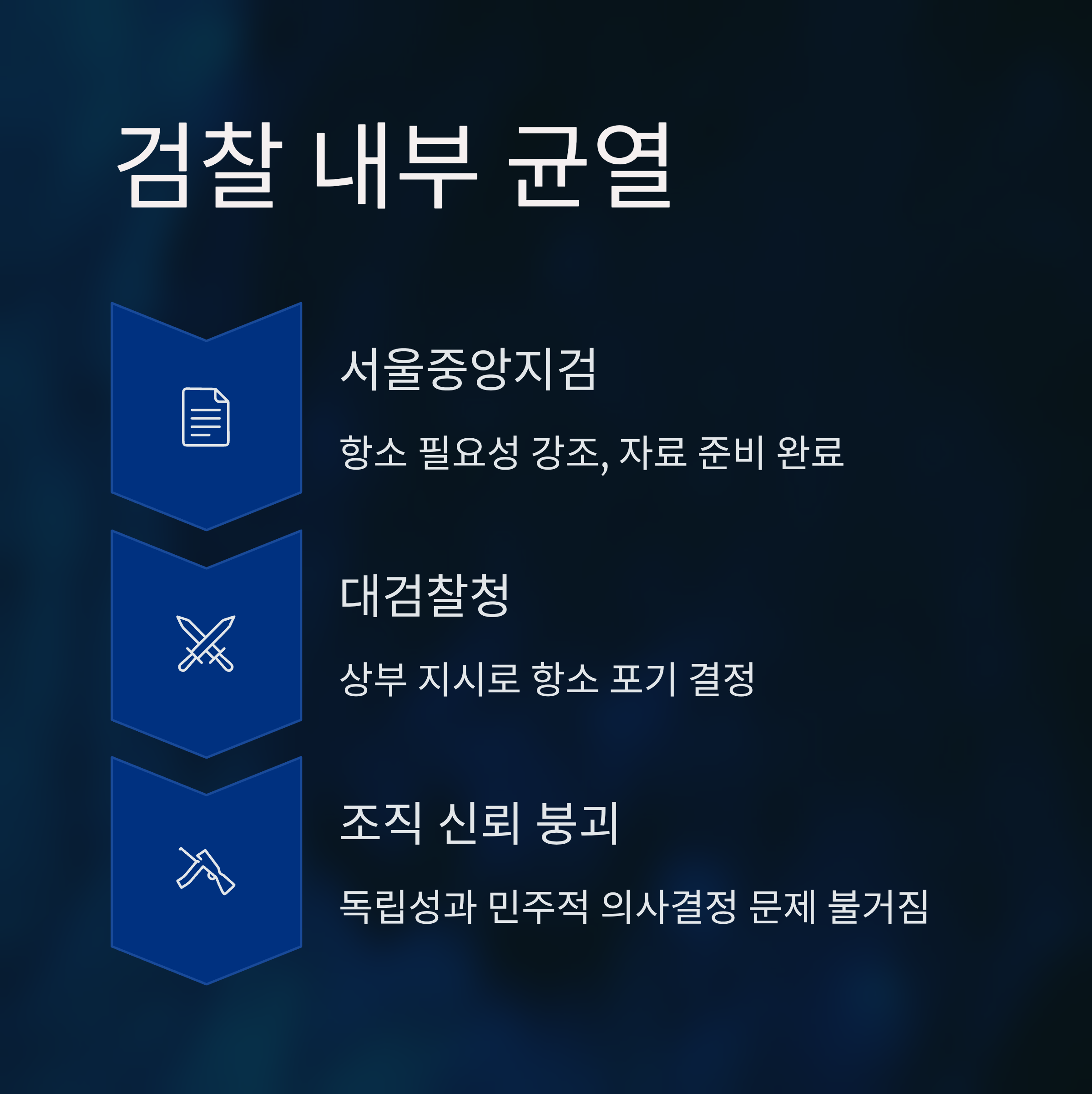 대검찰청과 서울중앙지검 사이의 의견 충돌은 검찰 내부에서의 균열을 명확히 보여주었습니다. 서울중앙지검은 항소의 필요성을 강조하며 자료와 논리를 마련했으나, 결국 상부의 지시에 따라 항소를 포기할 수밖에 없었습니다. 이러한 과정에서 조직 내에서의 독립성과 민주적 의사결정 문제가 불거졌습니다.