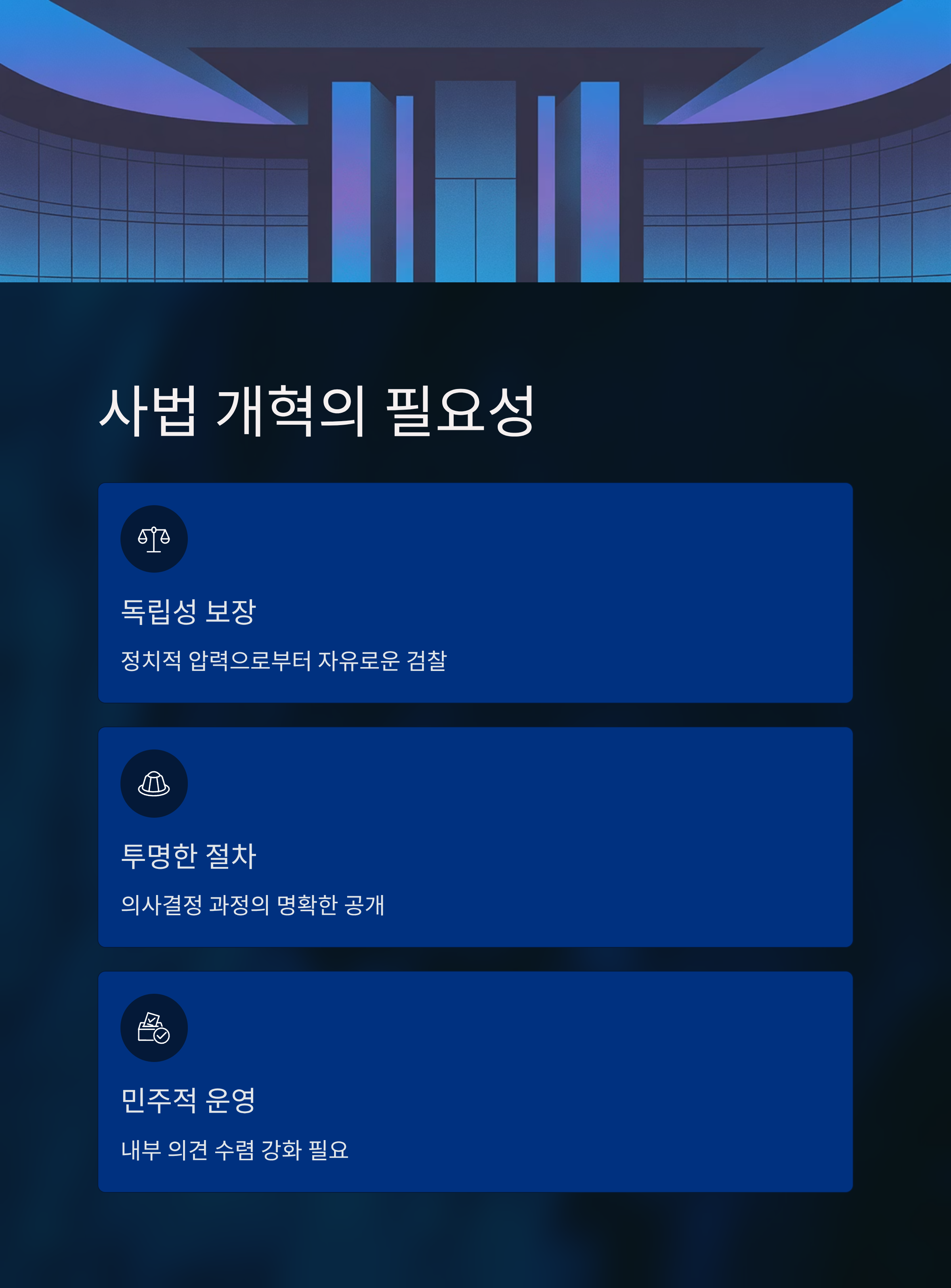 | A. 내부 조직 운영 방식을 재검토하고, 판단 과정에 보다 투명한 절차를 도입하는 것이 중요합니다. 내부 의견 수렴을 강화하며, 정치적 독립성을 보장하는 방향으로 나아가야 합니다. |